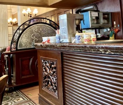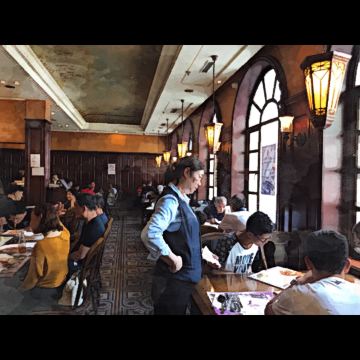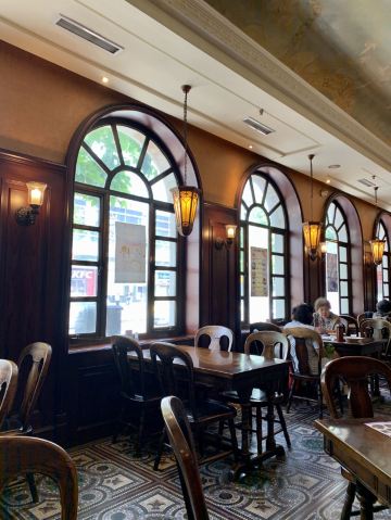 位于上海南京西路的德大西菜社,是老上海有名的西餐馆之一。 该店成立于1897年,历史悠久,不少老上海的初恋是从德大开始的,多少上海小夫妻在德大里“轧过朋友”,多少上海小囡是在德大第一次学会“左手拿叉、右手拿刀”...。具有百年历史的德大西菜社,在许多老上海人的心中都有一个美好的记忆,德大咖啡更是成为德大的一种文化特色被保留了下来。 环顾四周,厚重的旋转门、深色的木质楼梯,高挑的吊顶、实木的桌椅、马塞克的地砖、西式的窗楣、复古的吧台...... 经典的老三样:德大色拉、罗宋汤、炸猪排是必点无疑的,还有德大的蛋糕、咖啡也不可或缺。