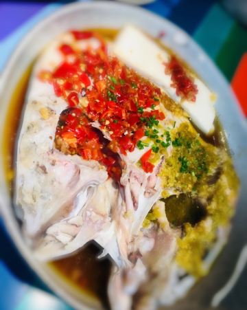 牛气冲天。望湘园酒家的老坛鸳鸯鱼头王不错 ,能同时满足吃辣与不吃辣客户的口味。