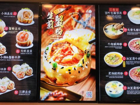 大虾生煎 一两(4只),荠菜生煎,虾仁生煎包,油豆腐百叶包粉丝,鲜肉生煎,生煎包和牛,春笋仔排汤,G小杨蟹粉双拼,油豆腐百叶包粉丝汤,牛肉酸辣粉,肥肠酸辣粉,小杨生煎,油豆腐牛肉粉丝汤(咖喱),藤椒大虾生煎,三拼生煎,酸辣粉,大骨头粉丝汤,鱼丸汤,上海小馄饨,牛肉汤(咖喱),龙虾生煎