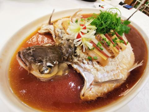 吃饭就别叫我了藏于梅奔中心边的世博源公馆,坐拥黄浦江一线江景,一楼以宴会大厅为主,步入二楼竟别有洞天,九间风格迥异的精致包房迎合不同客人的喜好。 欧式宫廷风包间满眼尽是奢华享受,墙上的艺术油画、雕刻装饰、水晶吊灯、皮质沙发,让人恍若置身在法国的凡尔赛宫,全景式落地玻璃窗,静坐其中便可远眺迷人江景,从味觉视觉上打造立体化之全新感受。 🦀️陈年萝卜蒸帝王蟹🦀️ 帝王蟹腿每一段都会剪开,服务员分盘以后吃起来相当方便,用筷子挑起肉质紧实的蟹肉,花雕酱汁色香诱人,丝丝蟹肉鲜甜回甘,吸收所有精华的肉饼更是让人欲罢不能 黑蒜也是点睛之笔,口感绵软,酸酸甜甜如蜜饯般让人心生愉悦,与雪花牛肉的搭配很好地中和了油腻感,层次递进变化丰富,肉食爱好者一定无法拒绝~ 🥩黑金雪花牛肉粒🥩 顶级日本雪花牛肉,大理石纹理清晰可见入口即化,送入口中瞬间被澎湃肉香所征服,发酵好的黑蒜➕炸过的独蒜片➕浓郁的黑松露酱,所有的美妙滋味都融汇在这一小块牛肉粒中。 🐟麒麟蒸东星斑🐟 鱼肉去骨切片,游头摆尾漂亮极了🥳切片后的东星斑被摆放成麒麟的形状,由此得名,上桌超有仪式感,淋上特调酱汁,闻着香气飘逸,让人食指大动,鱼肉蒸得恰到好处,入口还有弹性,细腻又有层次的口感,相信没人能抗拒。 最后以精致唯美的小鱼儿🍮杏仁布丁🍮收尾,地道融合粤菜的味觉飨宴,尽在世博源公馆,游走风味人间,让人饭毕仍是意犹末尽☺️