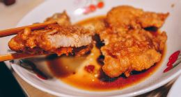 炸猪排很雷人,上来就是泡在倒好的辣酱油里面,又干又硬粉又厚,没有肉感了,难吃!