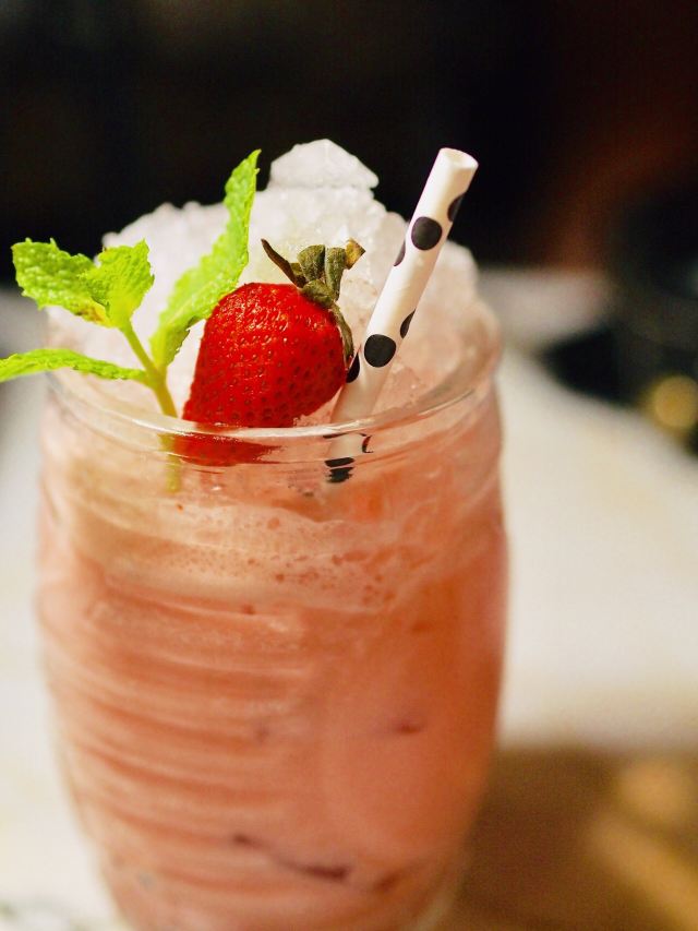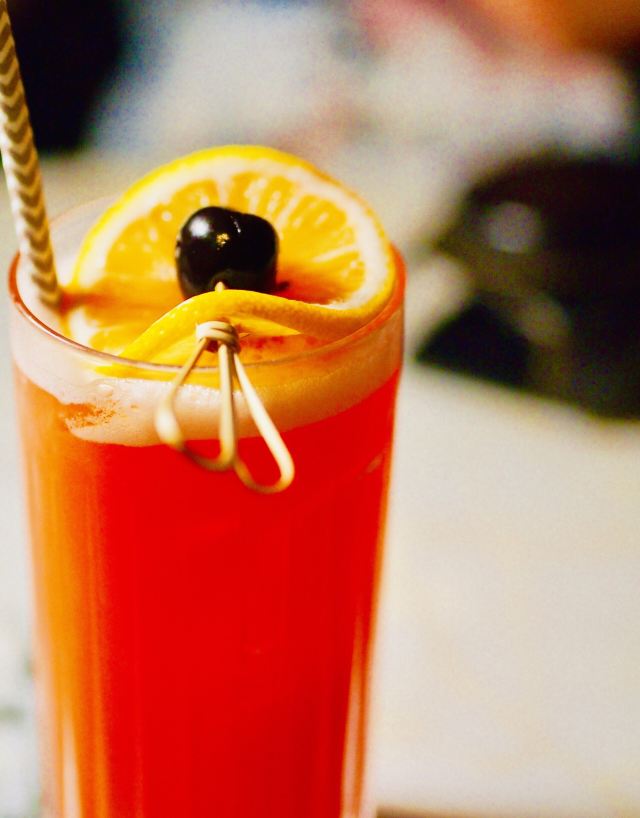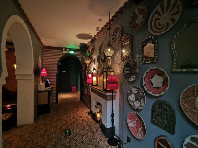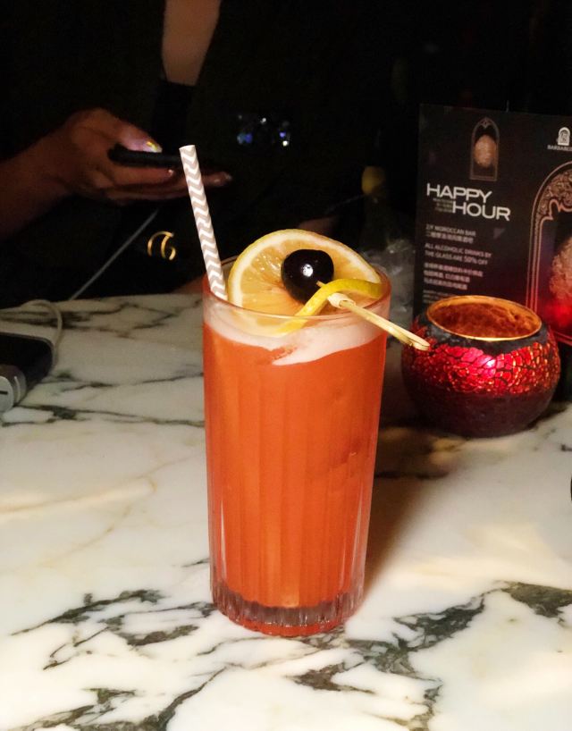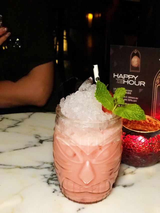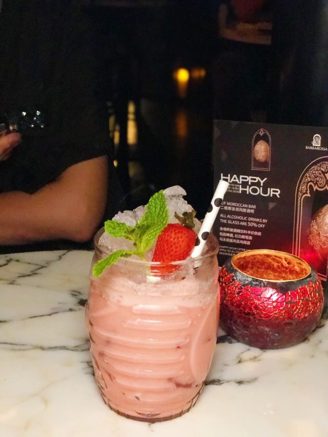 peachsai人广是块宝地,交通便利,四通八达的轨道交通,隐藏在公园里的一个小世界,在一楼吃完斯里兰卡蟹之后可以到楼上喝个小酒,摩洛哥风格,上了楼梯会感觉浓郁的异国情调。 喝酒还能抽水烟,水果味的还不错,淡淡的。当然喝酒的氛围很棒,当中是一排酒吧,边上的座位适合各种人群,1-2人,2-6人皆有。灯影的打造很有feel,不规则的花纹落下更增添了一点赶脚。点的都是鸡尾酒,bartender的水准ok。 mocktails很赞,都是无酒精的鸡尾酒适合我等不善于喝带酒精的酒又想感受一下的人。 草莓情缘,名字起的很带感,里面有新鲜的草莓还有凤梨加上椰浆和草莓糖浆,甜甜的带有热带水果的味道,很清新,就像前边荷塘里起了一丝涟漪。 水果摩洛哥可能就是一款店招,橙汁、凤梨汁混搭还有苹果汁和柠檬汁,酸甜可口,加了点红石榴糖浆水提高了甜度,就像这个夏季的风,浪漫不言自喻。 能喝酒的朋友都点了好几款,小酒微醺的感觉其实也不错。在这里relax一下,挺着缓缓的音乐,在黑夜中找到方向。