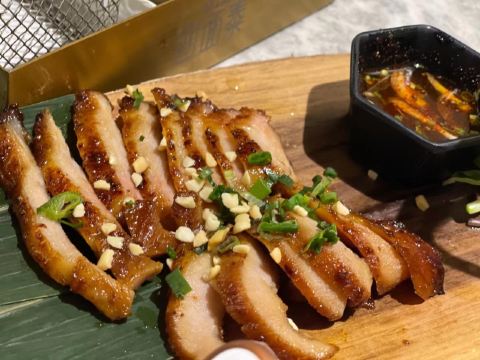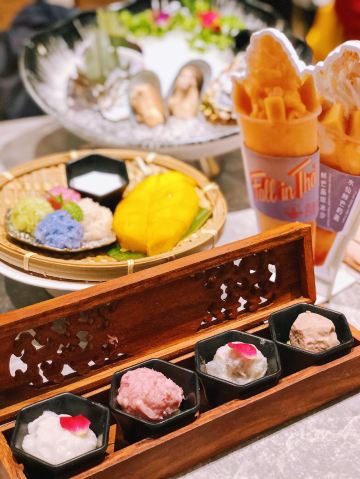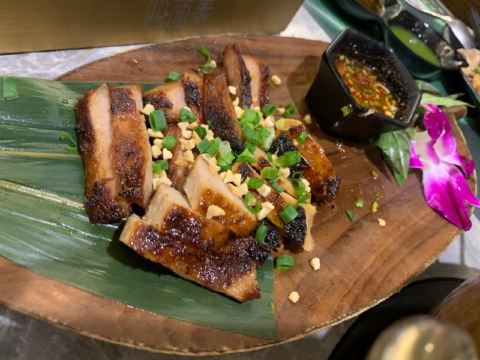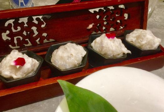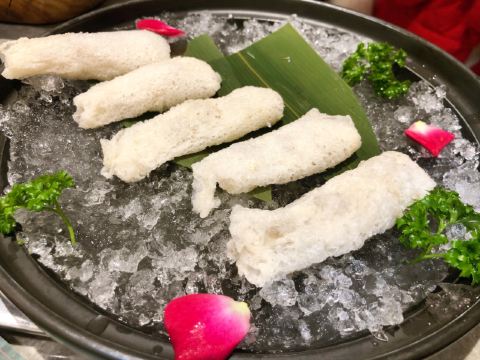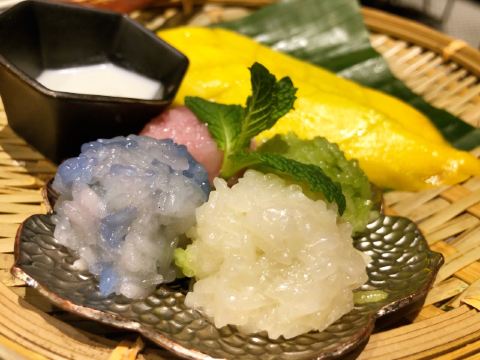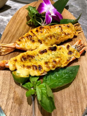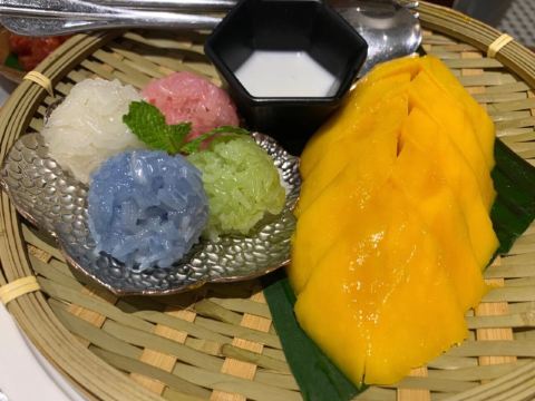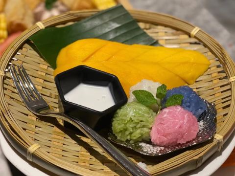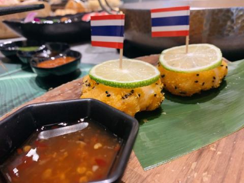 泰式手打虾饼,芒果四色糯米甜饭,手工竹荪虾卷,原只椰皇冻,龙虾片,雪花牛肉,招牌三味肉类拼盘,沙爹鸡肉串