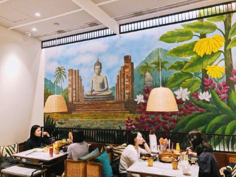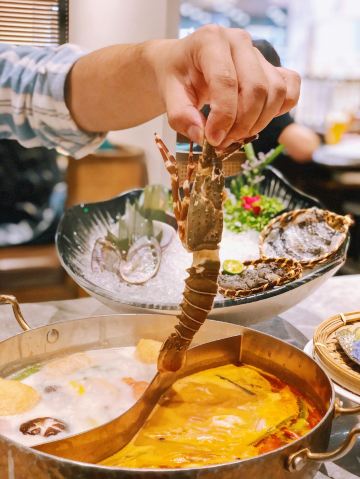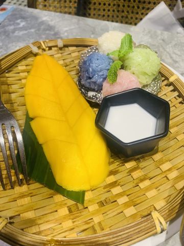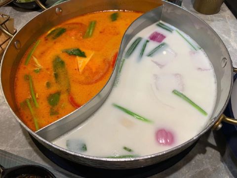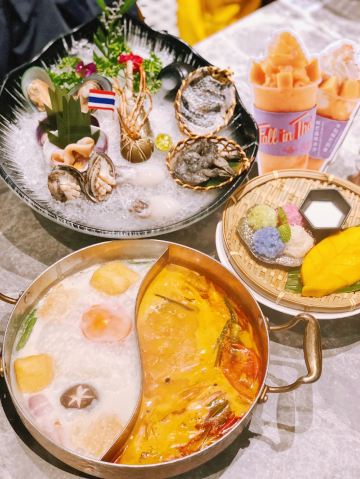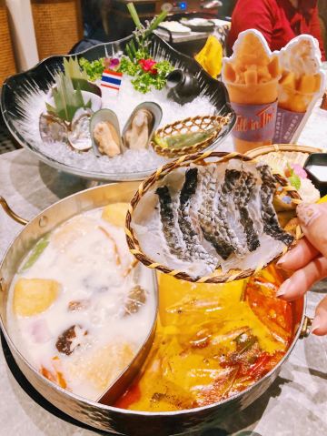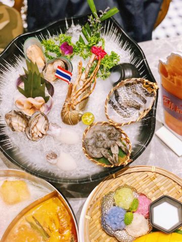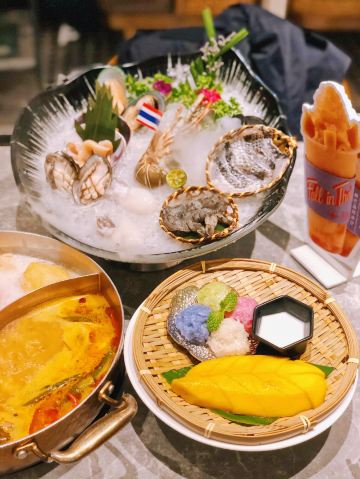 加油干饭呀万象城人气最高的泰式火锅店,工作日中午如果来晚一步就会座无缺席,四面泰传承古法鲜虾熬煮,为你献上舌尖上的萨瓦迪卡🇹🇭 两全其美的🍲招牌双拼锅底🍲,你吃你的冬阴功汤,我喝我的椰奶鸡汤,香浓椰奶融合养生鸡汤超级对胃,扑面而来热气腾腾,送入口中暖意融融。 店里的优惠活动“泰”给力啦,点海鲜组合就送豪华锅底和蔬菜伴侣,而且还免调料费哟,冬日里性价比超高的暖心工作餐,难怪我的小伙伴们三天两头就组队来拼单。 洁白如玉的鱿鱼仔,鲜活鲍鱼和天鹅蛋,还有小青龙和扇贝,诚意满满的海鲜拼盘豪气冲天,高蛋白低脂肪好吃不怕胖,涮入冬阴功汤底鲜辣又够味! 饭后必备芒果糯米甜饭,糯米控看上一眼就笑逐颜开,软糯香甜的米饭富有嚼劲,新鲜芒果果粒沁人心脾。