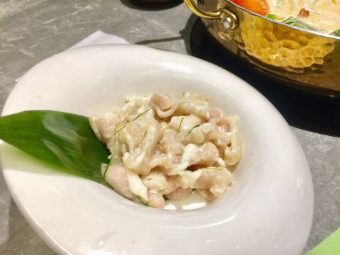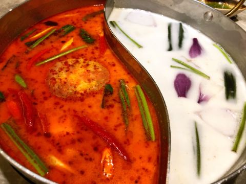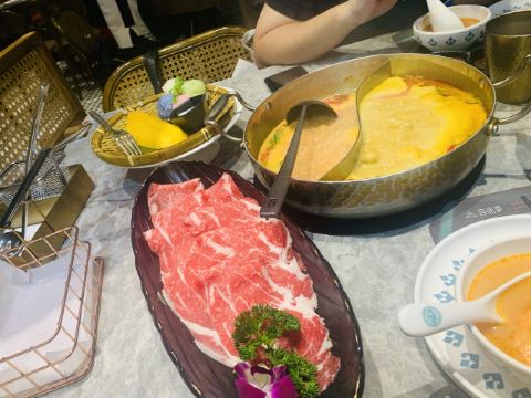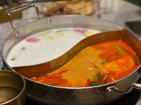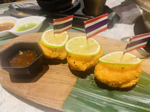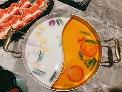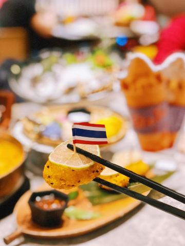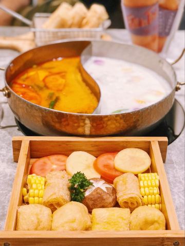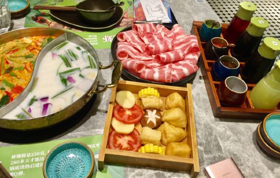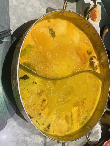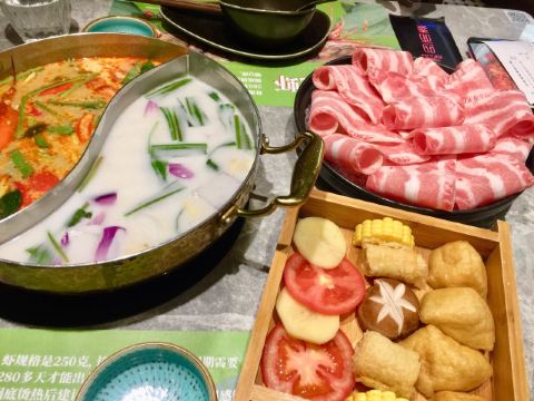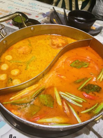痴痴的饿货中午和同事一起吃个工作餐,本来没想着吃火锅的,看到这家就很有食欲,泰式的海鲜火锅,能想到就是酸酸辣辣的很是开胃,而且这家还有团购的午市套餐挺优惠的,两人份也足够了,选了招牌的双拼锅底,必点冬阴功锅底刚开锅的时候还喝了碗,酸味为主稍稍带点啦,汤底的浓稠度正好毕竟还要涮火锅食材,浓度感刚好,椰奶也还不错,香香的相对比较清淡点。他们家虾饼挺好吃的,刚新鲜炸出锅,脆脆嫩嫩,一口下去满满鲜虾再蘸点甜辣酱更入口,功夫鱼片也还不错,下锅涮一会看到鱼片白白的就可以捞上来的,但鱼的鲜味没那么重,其他的菜偏虾肉为多,也还不错,还配了2杯饮品,很适合2-3人,推荐!