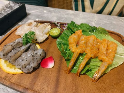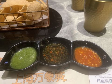 芝士香恋泰式火锅餐厅:四面泰 餐厅新开没有多久的餐厅使用正在搞活动,猜拳赢美味的黑虎虾只要8元,虾非常大有26cm,涮火锅非常好吃的,点了冬阴功龙虾锅拼椰浆鸡锅,锅底味道非常好吃,浓郁的椰浆非常香涮蔬菜和牛肉很赞!冬阴功涮海鲜就是绝配,配上酸酸的辣辣的调味汁美味不要等……餐厅的调味汁非常有特点,雪花牛肉片、猪颈肉、还有非常惊艳的芝士流心虾滑,口感超级棒!餐后还送龙虾片,又吃又拿的好开心……啦啦啦[调皮] 总结特点:食材用料好、调味汁有特点、服务热情、价廉物美、可以说是我目前吃过的泰式火锅里面最喜欢的餐厅,不是真的好绝对不会推荐的!