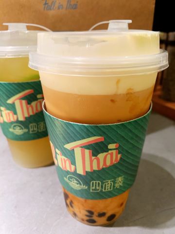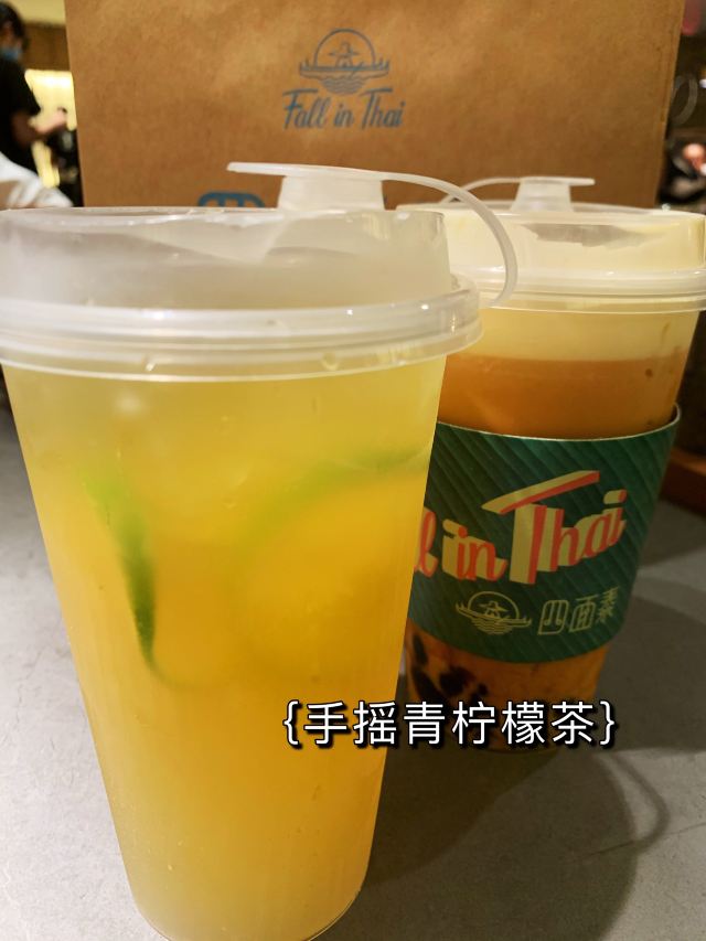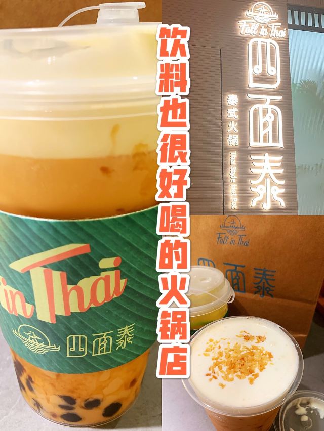 FALL IN THAI❣️去年开的一家火锅店,一直没有吃过。这次看到有卖饮料套餐,一份只要13.8元,p484就来一份吧!结果出奇的好喝呀! 📍地址:吴中路1599号万象城二楼。 🌿【环境】南洋风情的装修,水吧在门口,估计也是方便做饮料外卖生意。 💁♀️【服务】店员会给你推荐饮料;等位时还有龙虾片可以吃。 💡套餐内容:两杯饮料➕一袋龙虾片。 🥤【口味】 「泰式啵啵拉茶」这个太好喝了!跟店员说不喜欢太甜的。所以调整甜度后,拉茶一点也不甜腻,甜度正好很健康;茶味很浓郁,不是那种香精味;啵啵超软糯,和X茶的感觉很像!推荐! 「手摇青柠檬茶」原本以为不会很甜的,所以就没有调整甜度。结果…感觉甜疯了[笑哭]又甜又酸,而且有点香精味道,这个不推荐。 🌈后悔没有多买几份套餐,真的太棒了!物超所值。
