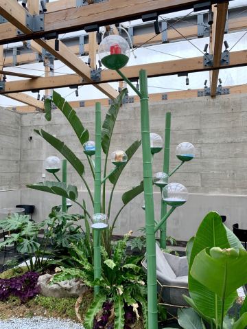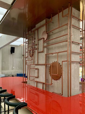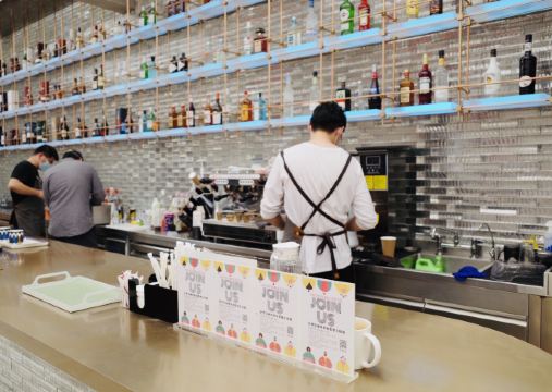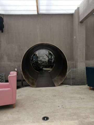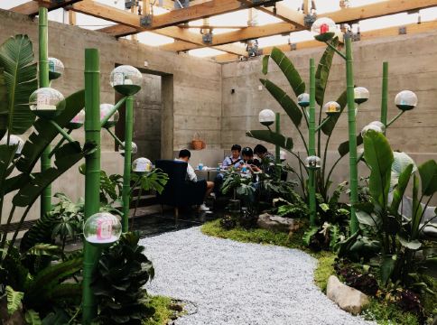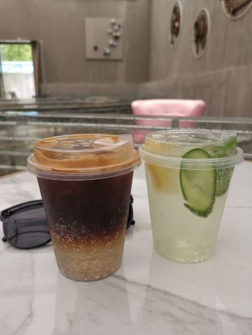peachsai收藏了有段时间了,发现离开公司不远么就去试试。没想到还有点距离,不过一路沿着杨浦滨江,在时尚中心不到点,那个区域都在修路,早知道一部差头了,吃了一鼻子灰。一个转弯进入,要小走一会就看到了,没想到在外面搭建的卫生间还挺ok,很干净。 [薄荷]环境:这家咖啡馆把还兼顾一个酒吧,不但有喝的也有些餐食之类的。节假日难免人多扎堆,满场的节奏,环境还不错,但是细节还不够。当中有像水泥管状体连接,后面有透光的花园,有假的竹节,上面的玻璃球体里面放着各种香皂的展示。 出门上二阶,各种mark的池,格栅、气浮、生物转盘等,远眺可以看到横跨的杨浦大桥🌉,露台花园还挺大的,可以吹吹风看看杨浦滨江的景。 室外一面砖墙上彩色复古的肥皂广告美女蛮吸👀......都是小时候用过的上海🧼牌子! 「红柚气泡」 咖啡不想喝了,就点了杯气泡水喝喝,甜度稍微偏甜了点,酸甜口感,因为过来有点出汗喝喝冰饮还是蛮爽的! 甜品种类不多,选了个有特色的上海制造,跟一块肥皂一样,是椰子口味的,夹杂了点芒果🥭比较绵软,还有脆脆的椰子片搭配,量不大,随便吃吃还行。