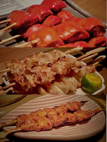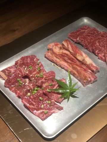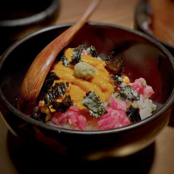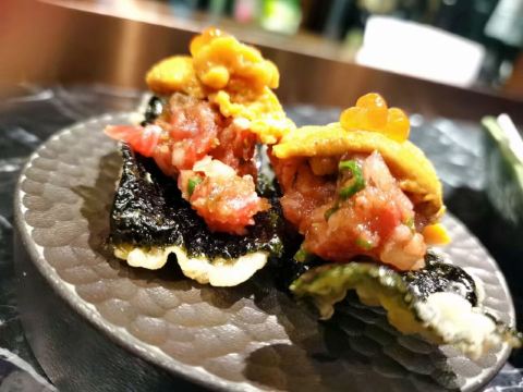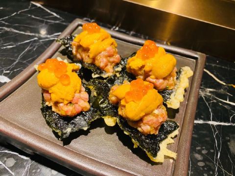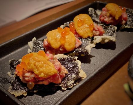 巧克力m9和牛,A5和牛肉眼,海胆和牛塔塔,厚切牛舌,海胆和牛拌饭,猪鼻筋,烧鸟,和牛三明治,花雕陈皮浸甜虾,味噌芝士条(小食任选三种),紫苏椒盐炸鸡胗