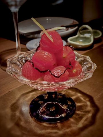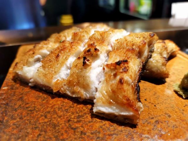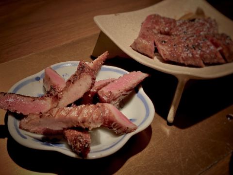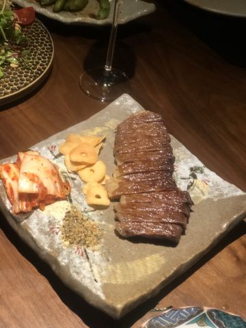 蛋花食游记周末和朋友小聚,选了这家日式烤肉店。店面隐藏在古北的高档住宅区,有种大隐于市的感觉。装修精致奢华,就餐环境非常好。服务做的非常好,服务员全程帮烤,烤前会询问客户喜欢的口味,从而烤制相对应的美食 炭烤猪鼻筋,第一次出猪鼻筋,烤制的正好,有浓郁的猪肉的烤香味,入口鲜嫩爽脆,又带着嚼劲,好吃到停不下来。 和牛海胆三文鱼籽塔塔,底层是炸制酥脆的海苔,中间是和牛塔塔,上面是马粪海胆。一口下去海胆的鲜甜搭配着和牛的绵密顺滑席卷着你的味蕾,底层的海苔增添了脆度,让整体菜式的口感增加复合,层次感更加饱满,好吃 干式熟成M9和牛西冷,老饕们的最爱。牛肉的香味很浓郁,肉质细嫩,牛肉特有的油脂感醇厚芳香,回味中带有淡淡的果香味,有点火腿的感觉,很赞 总体来说非常棒的日式烤肉店,环境,口味,服务都非常棒,适合朋友聚会的好去处