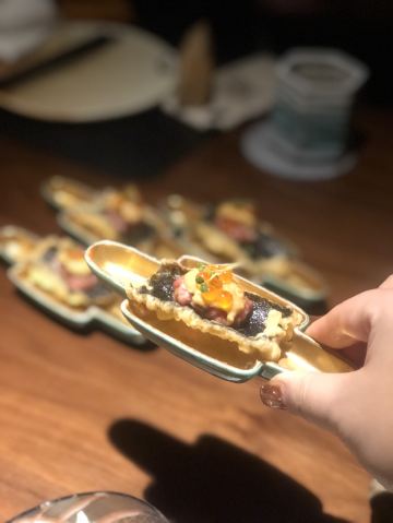 HIGH YAKI modern izakaya & bar周末和朋友小聚,选了这家日式烤肉店。店面隐藏在古北的高档住宅区,有种大隐于市的感觉。装修精致奢华,就餐环境非常好。服务做的非常好,服务员全程帮烤,烤前会询问客户喜欢的口味,从而烤制相对应的美食 炭烤猪鼻筋,第一次出猪鼻筋,烤制的正好,有浓郁的猪肉的烤香味,入口鲜嫩爽脆,又带着嚼劲,好吃到停不下来。 和牛海胆三文鱼籽塔塔,底层是炸制酥脆的海苔,中间是和牛塔塔,上面是马粪海胆。一口下去海胆的鲜甜搭配着和牛的绵密顺滑席卷着你的味蕾,底层的海苔增添了脆度,让整体菜式的口感增加复合,层次感更加饱满,好吃 干式熟成M9和牛西冷,老饕们的最爱。牛肉的香味很浓郁,肉质细嫩,牛肉特有的油脂感醇厚芳香,回味中带有淡淡的果香味,有点火腿的感觉,很赞 总体来说非常棒的日式烤肉店,环境,口味,服务都非常棒,适合朋友聚会的好去处