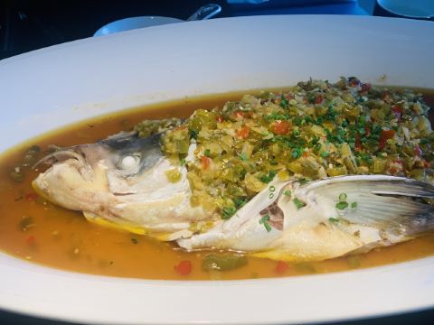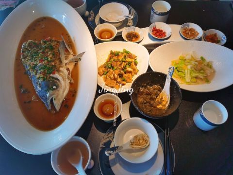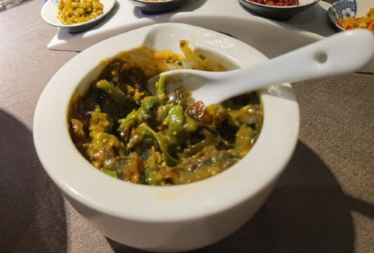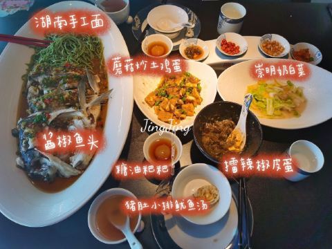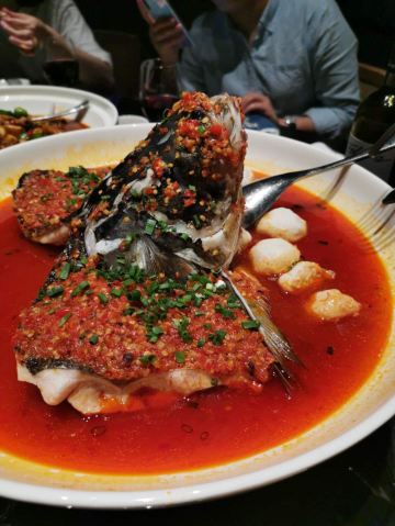 世界那么大可我只想走遍中国其实不太会吃辣,看菜单觉得应该有几个不辣的,结果似乎就是糖油粑粑是真的一点不辣,怪不得很多人觉得这个最好吃。 重头戏是鱼头!鱼本身没太重的辣味,幸好我及时阻止服务员要分鱼头的举动(这是个完全没必要提供的服务啊),因为那汤是辣的,还有铺在上面的辣椒末。自己动手处理掉大部分辣椒末,拌上面条,鱼肉沾沾汤,这味道还是可以的。不过没看到之前体验的DPER提到的鱼丸,虽然我还蛮期待鱼丸的,因为之前在许爷吃到的鱼丸汤让我念念不忘。 另一个大菜是云笋猪肚,基本是不辣的,但带有点胡椒味。猪肚烧煮到软糯,味道也不明显,笋非常嫩,就是汤偏咸,我们把喝的柠檬水倒进了大半瓶,这下就合适了。 口蘑土鸡蛋,原以为这个菜是不辣的,然而是那天最辣的一个!因为鸡蛋本身就是超辣的!再加那一堆辣椒。其实在下单前,我们曾建议这个菜的辣椒就别撒了,然而回答却是不撒辣椒炒不了???明明蛋归蛋辣椒归辣椒,怎么就炒不了?建议别放辣椒其实也是相避免不必要的浪费啊,我宁可量少些给我换个小碟装。而菜名中的口蘑只有一丢丢,几乎在口感上可完全忽略,绝对应该改名为辣椒炒鸡蛋。这过分的辣已完全掩盖住鸡蛋天然的香味和口蘑之鲜,对不起那名字呀。 擂辣椒皮蛋,还好捣碎前先上了一下桌,我迅速把顶上的辣椒都去掉(有半盘子!还有好多盐),之后再让服务员去粉碎,这下只有些微辣意,让这个菜一下子好吃了。 糖油粑粑终于上来了,经过前面那一顿火辣辣的菜,尤其显得这款甜品的美味,口舌得到缓解。 服务态度方面,可能那天比较忙,服务员只能兼顾各桌。所谓餐前询问是否能吃辣,仿佛只是个形式而已。水瓶漏水,提出后也没给换一个,倒一小杯能有三分之一在桌上。