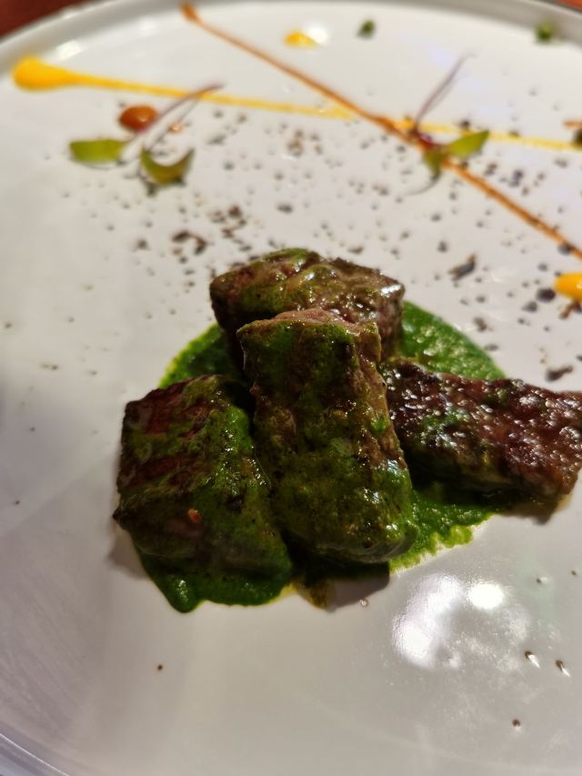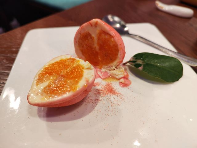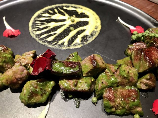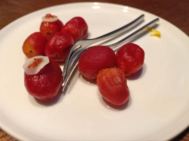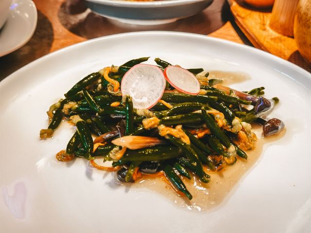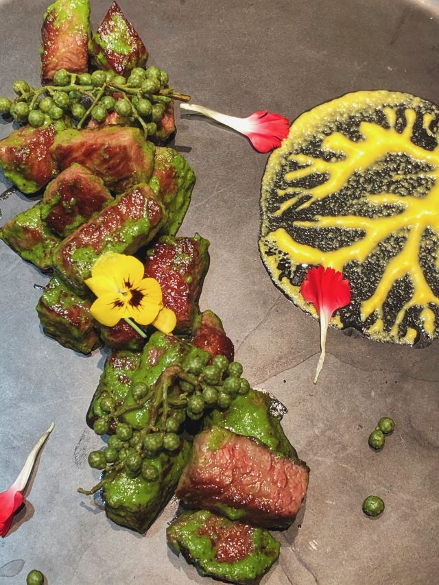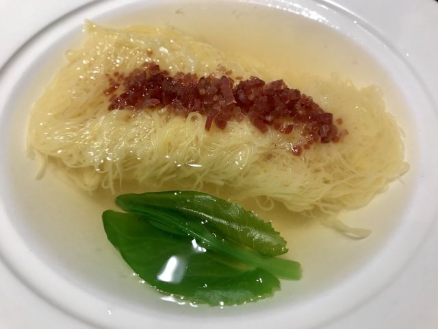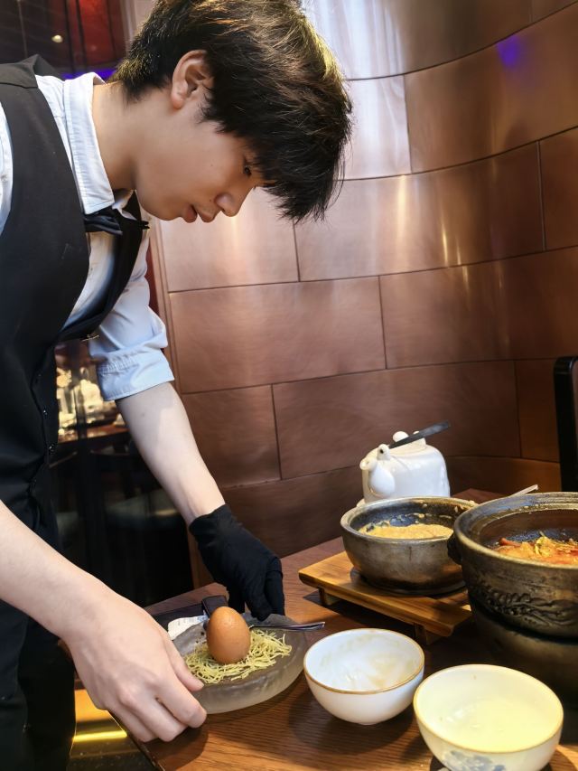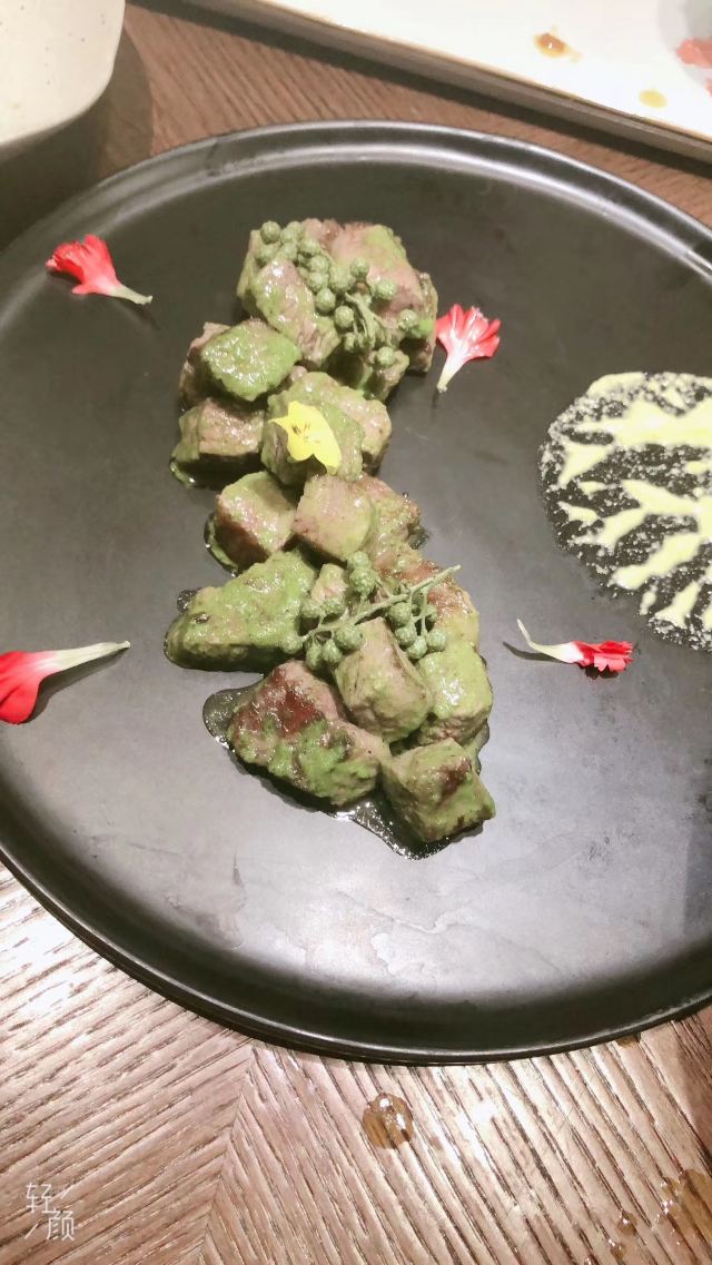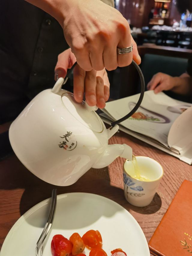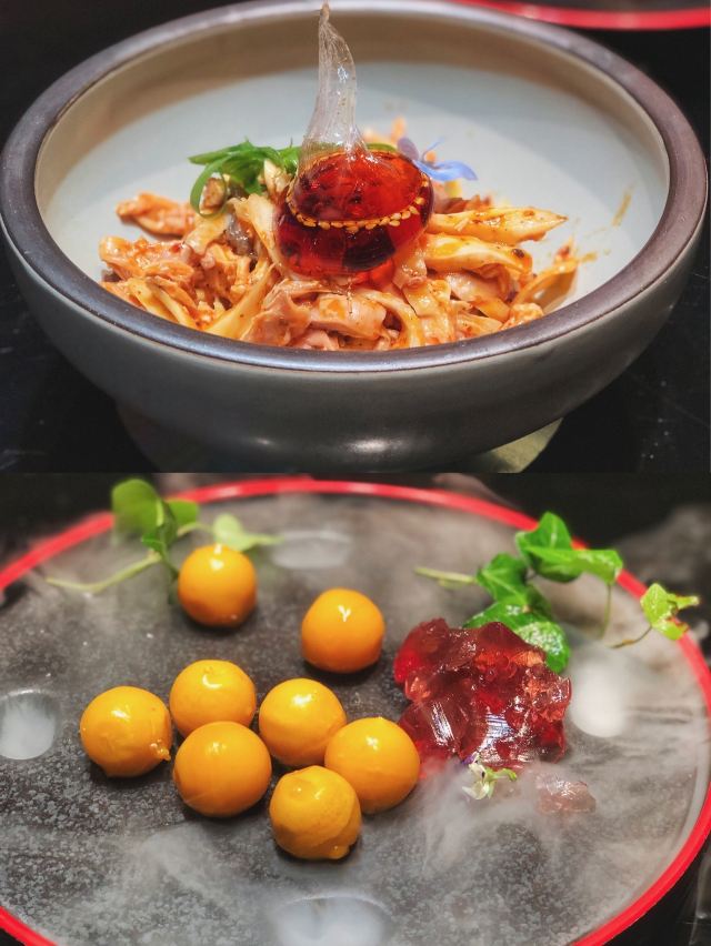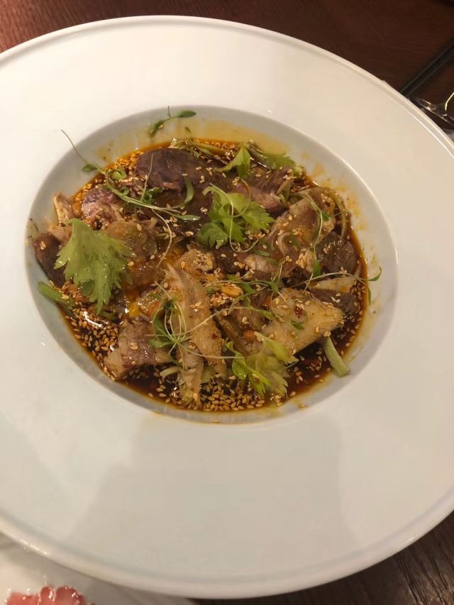 Iamis【环境】 环境不错,座位间距合理且舒服。安安静静的就餐环境。 【服务】 服务很好,略忙碌,但也能及时响应。换盘也很主动积极。整体上菜速度很快。 【口味】 「餐前水果」糖渍的小番茄,甜甜的,微酸,饭前饭后都不错。 「椒麻安格斯雪花牛肉」牛肉很嫩哦,椒麻适中,摆盘也很好看。 「蓉城鸡豆花」鸡豆花吃过好几家餐厅,这家鸡豆花甚是细腻,当然,量也不大,较薄。 「樱花虾米汤豆苗」这道惊艳之处在于汤汁,是米汤汁。豆苗很好吃,樱花虾量也多的,很补钙。 「大刀金丝面」厨师会推着小车来到餐桌旁,现场切面,然后现场煮,真的是细呢,最后入口的口感和面条的口感不太一样,观赏性佳。只是对比这量,价格就小贵了。 「醉熟大闸蟹」季节品,一雌一雄,肥壮,卤味好,配了吃蟹工具,还有黄酒,吃得很欢乐!