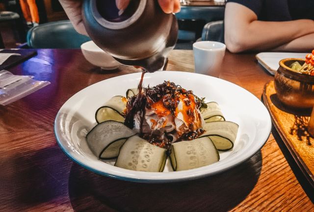 早前就了解到映水芙蓉是沪上经典的川菜品牌辛香汇创立的新品牌,因为对辛香汇的印象一直很不错,觉得这个品牌菜品性价比高,而且口味还很不错,所以这次款待从成都来的朋友就选择尝试一下他们的新品牌。 🌿 餐厅位置挺不错的,从2号线中山公园站进入来福士商场,乘坐电梯到4层就是餐厅门口了。餐厅的装修典雅,诗意从餐厅门头的小景一直延续到餐厅内部各色中式元素装修上。入座后茶已在烹,用藤条扎着的餐布静静地躺在长方形的餐盘上,充满诗意。只是,翻看菜单的时候稍显失望——我期待这是一家主营创意川菜的餐厅,可是菜单上却是各色经典川菜,此刻非常担心这只是一家高价辛香汇。 🍲 【餐前水果】是糖渍的圣女果,我并不太喜欢圣女果的酸味,但是这家店的圣女果却十分出彩——剥了皮的圣女果糖渍得十分到位,果肉浸入了糖水,很好地中和了微酸的口味,口感也不像新鲜圣女果那么爽脆,而且软糯的口感,让人忍不住多来几盘。【敲糖棒棒鸡】食用前需要将糖衣中的红油敲碎后搅拌均匀,鸡肉选用的是鸡腿肉部分,鸡肉肌理吸足了红油,肉质鲜嫩,我和同行的朋友都一致认为味道很不错。【野山菌炒土鸡蛋】堪称经典,一块鸡蛋入口,川渝地区善用的菜籽油香气霎时挥发出来,这炒蛋简直令人梦回成都。【口味猪蹄】是猪蹄先卤后炸,后加入辣椒、花椒调成的酱汁中浸泡制成的,皮脆肉糯,而且猪蹄切成了小块,比较好入口。【栗子金汤白菜】的白菜在汤中炖煮多时,不仅菜叶吸入了鲜美的汤汁,而且整体口感是比较软,味道不错。餐后甜点【成都茉莉花茶布丁】堪称经典——入口能感受到一丝茉莉花茶的清香,奶精带来的香气紧跟着茶香散发出,成为后调进行收尾,这时不得不佩服菜品的研发能力,将几种味道调和得恰到好处。【桃满天下】是白巧克力作为外壳,内馅是一层奶油与橙子味的冰沙,只是不太确定这道甜品的最佳品尝时间是离开冰箱后的多长时间,因为这次品尝时吃到未化的冰沙和已经有些融化的冰沙,两种口感的揉杂略显奇怪,不确定哪种口感才是店家想要呈现给客人的,希望研发部门能给出比较准确的答案。此外这道甜点,除了外形与桃子一样外其他可谓毫无关联,希望能做到“表里如一”。 不得不说,整个一餐体验下来后,觉得映水芙蓉这个品牌虽主打的是经典川菜,但是菜品的设计、口味搭配都很用心,不似经典川菜那样过多使用辣椒面增添风味,但是却也带入了川菜的特色。