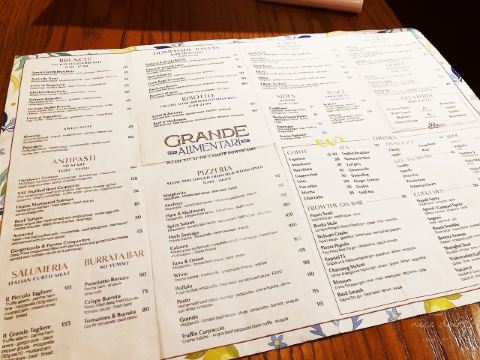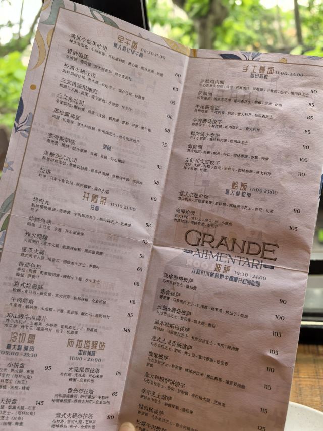 Grande 招牌披萨,冷切肉拼盘,三文鱼水波蛋,三文鱼色拉,招牌披萨,水果松饼,牛肉酱意面,三文鱼班尼迪克,XXL烤牛肉薄片,鸭肉酱小宽面,燕麦酸奶碗,Margherita玛格丽特,香肠焗蛋,松露生牛肉,牛油果吐司, 番茄色拉,吉奥斯托潘妮提拉米苏味蛋糕,布拉塔芝士