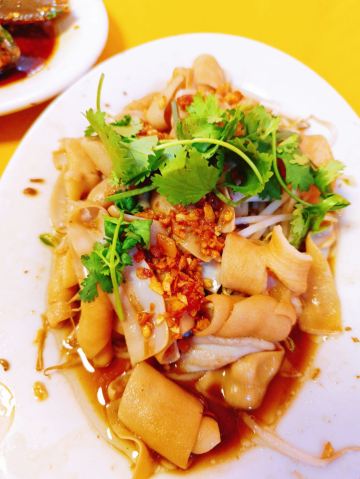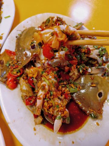 焕焕汕头行终于安排上一直没安排上的“打冷”了。[色] 标准的夜宵大排档,选择很多。有生腌、白粥小菜、猪脚、鱼饭、各类海鲜、格式小炒…… 【膏蟹蒸乌冬】🌟🌟太赞了!当地菜市场去了几次发现这里膏蟹的品种跟平时上海卖的不一样。肉质鲜甜,肉嫩而饱满,虽然不是食蟹最好的季节但是蟹膏香肥。最后拿勺热油尽显粤菜风味。 【生腌虾姑、雪蛤】🌟雪蛤按上海叫法是“宁蚶”鲜嫩到“打耳光阿罚肯放”[偷笑]。虾姑整条腌制的上桌前剪小,很潮汕的腌法,可我还是觉得没有普通虾口感肥美,另外是濑尿虾壳刺多,比较费舌头。 【炒薄壳】就是爆炒的小贝壳,“薄壳”类似“海瓜子”壳薄,肉小而肥嫩,喜欢吃这类费嘴的一定要试试!反正我是爱死它了。 【白粥和小菜】汕头白粥不像广东粥煮到那么融,基本就上海煮久的泡饭感觉。“麻叶”当地特色,应该是炒过的,超级香,配粥必须有。“红米”就是小蚬子肉,很有特色的小菜。我是2菜拼一盘。 【猪脚】卤的猪蹄,还有同卤的猪皮和肥肠可选。我选了猪手和肥肠双拼,猪手没吃过瘾[囧]