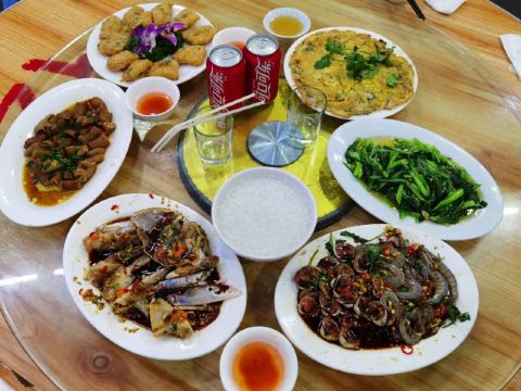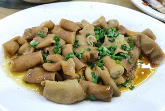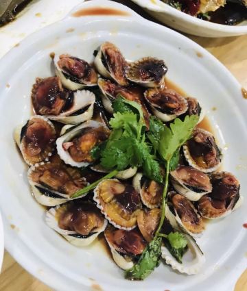 生腌海鲜,鹅肝,炒鹅肠,蚝烙,海瓜子,黑蒜烤生蚝,粿条,青菜,淹血晗,腌虾菇,白粥,生腌血蛤,螃蟹,麻叶,鱼饭,鱼丸,薄壳