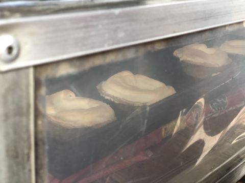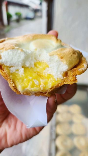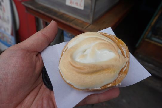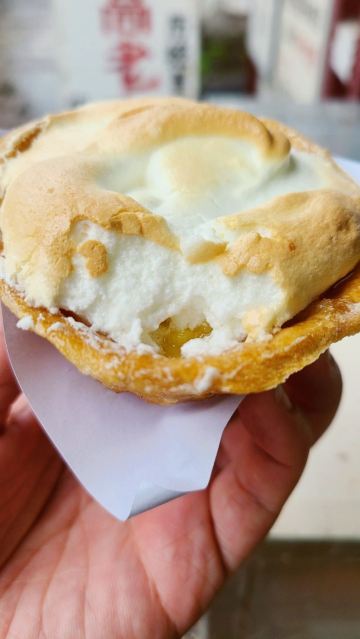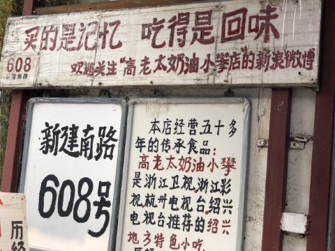 Gaolaotaizhengzongnaiyouxiaopan (xinjiannanlu)在绍兴,最有名的“小攀”莫过于高老太的小摊位了,一块泛旧的白色木板斜倚着一家小商品店,上面红黑大字十分抢眼。并不见有老太太,只有一对五十来岁的夫妇打理着店铺,打理着“小攀”,他们自称是高老太的后人。招牌后的木桌上的玻璃罩里排列着几个土黄色的“小攀”,因为没有太多的奶油,卖相不如西点那么鲜艳油亮诱人,这也正是中西烘培融合出来的质朴和健康。 热乎乎的“小攀”,拿到手中不太好下口,老板娘让我一定要端平,后来理解了她的意思,因为手腕一歪,里面的汁水就流了下来,好像这就是高老太的独到之处,我尝过其他店里的“小攀”,并没有这么多的汁水。所以吃相就不太好看,一下口就满嘴的蛋清乳脂,甜而不腻,十分爽滑,陷是软黄的,带着果浆的清甜,与外层松脆的小“碟”咀嚼一起,倒也不觉得很腻,但也不能多吃。 旁边两个女生已吃得相当狼狈,还问老板娘要水洗手,挺神奇的中西结合的传统甜点。
