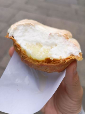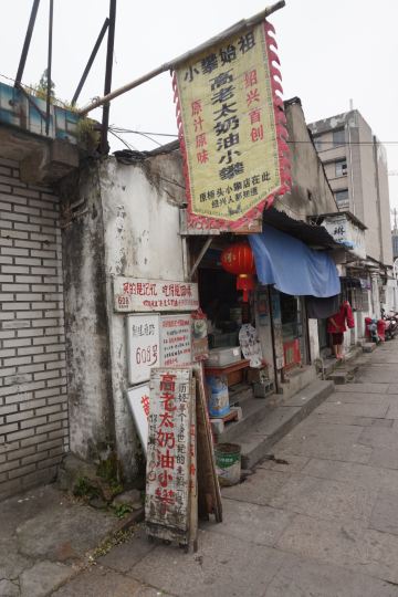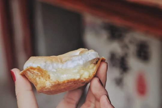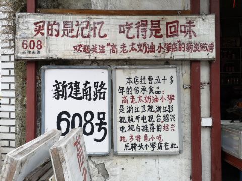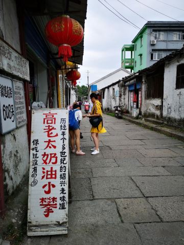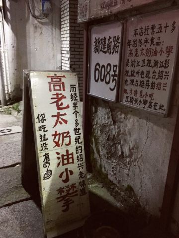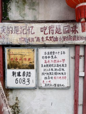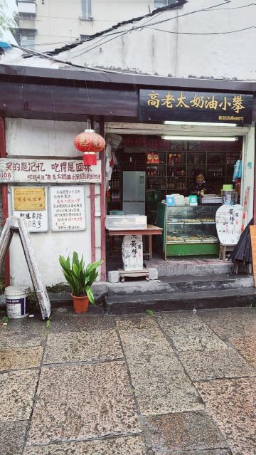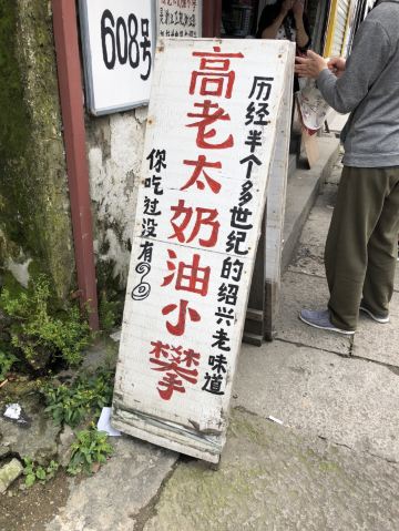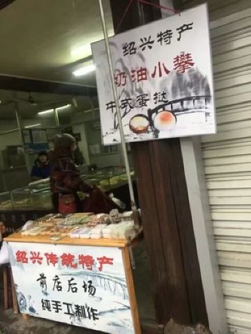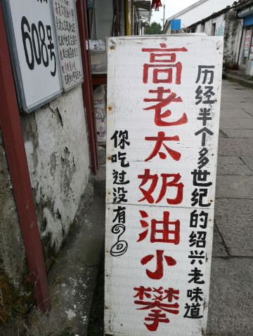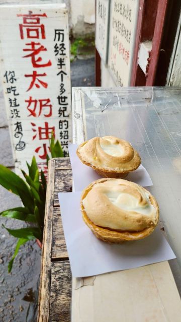 SophyJiang漫旅绘在绍兴,最有名的“小攀”莫过于高老太的小摊位了,一块泛旧的白色木板斜倚着一家小商品店,上面红黑大字十分抢眼。并不见有老太太,只有一对五十来岁的夫妇打理着店铺,打理着“小攀”,他们自称是高老太的后人。招牌后的木桌上的玻璃罩里排列着几个土黄色的“小攀”,因为没有太多的奶油,卖相不如西点那么鲜艳油亮诱人,这也正是中西烘培融合出来的质朴和健康。 热乎乎的“小攀”,拿到手中不太好下口,老板娘让我一定要端平,后来理解了她的意思,因为手腕一歪,里面的汁水就流了下来,好像这就是高老太的独到之处,我尝过其他店里的“小攀”,并没有这么多的汁水。所以吃相就不太好看,一下口就满嘴的蛋清乳脂,甜而不腻,十分爽滑,陷是软黄的,带着果浆的清甜,与外层松脆的小“碟”咀嚼一起,倒也不觉得很腻,但也不能多吃。 旁边两个女生已吃得相当狼狈,还问老板娘要水洗手,挺神奇的中西结合的传统甜点。