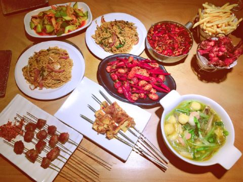 炭烤大油边,辣炒黄蚬子,牛肉串,炒方便面,大油边,牛熟筋,麻辣龙虾尾,奚记麻辣烫,羊肉串,牛肉小串,烤熟筋,干香土豆片,冷面,奶香面包