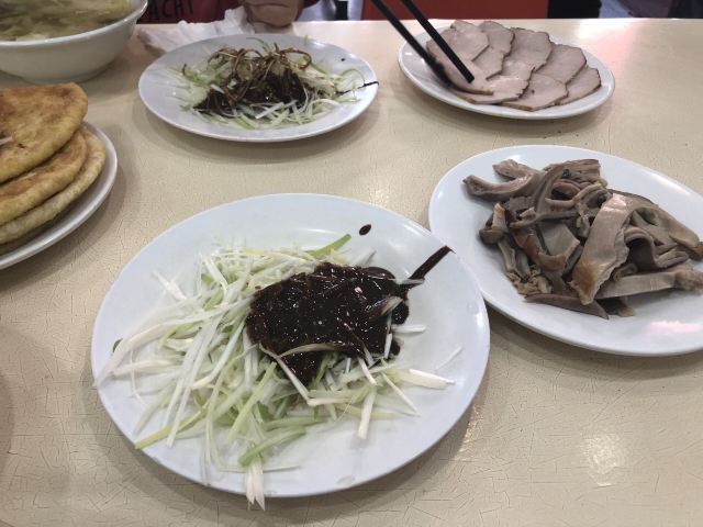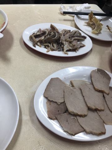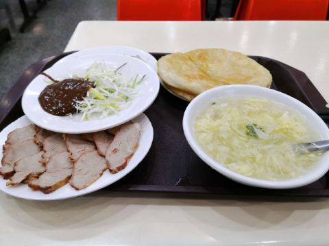 青青岛-东北这个温度真是受不了,在沈阳故宫溜达了一上午直接是给冻透了。出门后往中街方向走,路过刘老根二人转后的一个小路口,发现了这个有历史感的牌子,熏肉大饼总店,里面饿了起来。冬天吃肉是最好的动力来源。进门一看是个2层餐厅,看来是买卖不错,一楼头上有个点餐的地方,人少可以这里点,根据价格不同,小份肉的数量也不同,要了小份的熏肉和肚,2张饼,一个蛋花汤,一份葱酱。小票给旁边的取餐柜台,有个清冷的美女负责给你配餐然后自己端走。人多在座位上给菜单点,还有炒菜啥的。感觉熏肉的味道和其他店都差不多,酱偏咸点,一楼一个清瘦年轻的女孩服务非常主动,也很周到。另外一个稍微矮胖有点上年纪的女银明显偷懒,爱动不动的。整体老传统的店铺,味道价位都不错,装修和经营模式有点老国营的感觉。