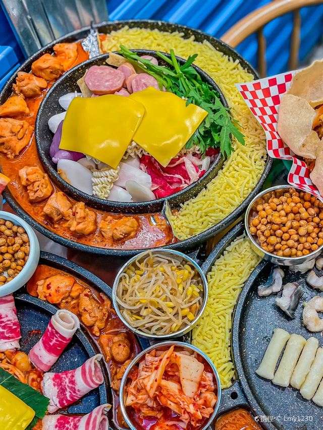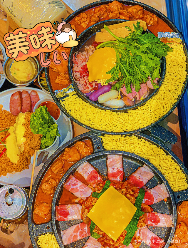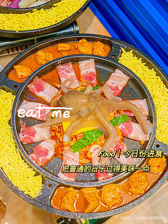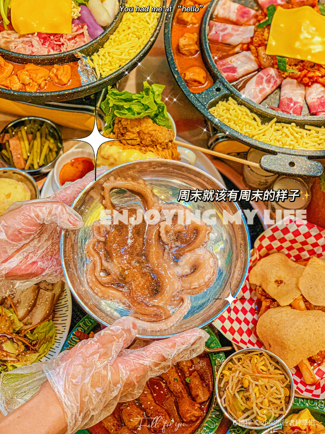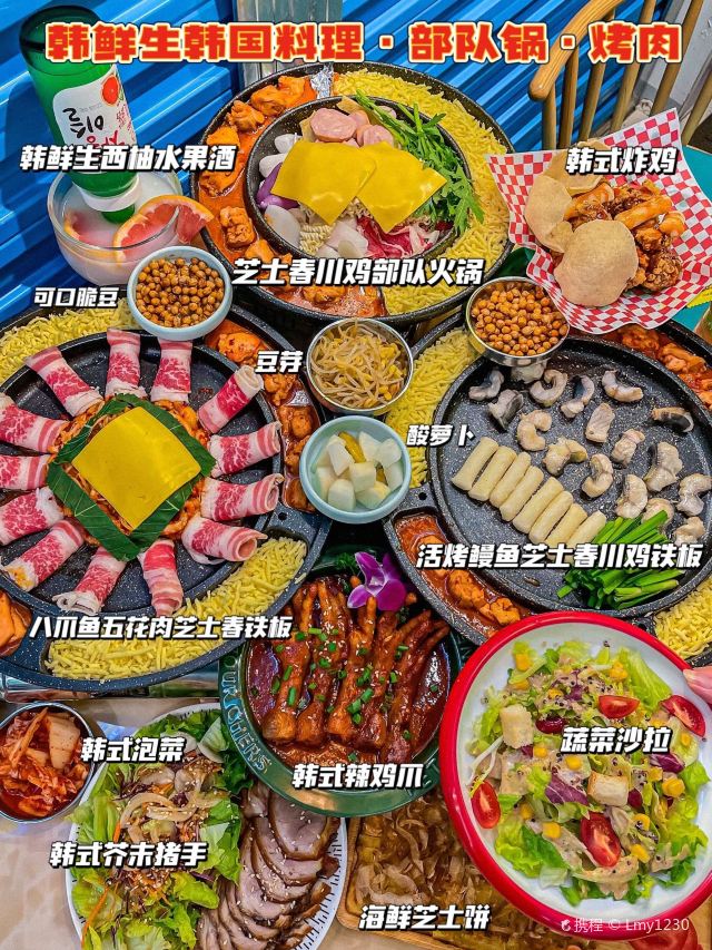 欣欣酱0214#我是种草官 作为韩料女孩这家韩料我真的N刷! 芝士春川鸡部队实在是太绝啦! 每次跟朋友来吃,都能吃到肚子胀起来🤣 . 店内装修的超级像在han国街头! 仿佛走进了han国街头🇰🇷 超级棒的沉浸式体验👏🏻 每个空间都超级好拍再加上韩ju贴纸 你就是韩剧女主角了🧚♀️ . 🧀芝士春川鸡部队 必点两个字说腻了哈哈🤣 四周是芝士🧀和辣鸡腿肉🍗 超长拉丝芝士裹着辣鸡腿 中间是部队火锅煮的咕嘟咕嘟的~ 分量真的超级足‼️一大锅满满都是料 感觉两个女生吃这一锅就饱饱的了🥰 . 🧀八爪鱼五花肉芝士春川鸡铁板 一大锅上桌,中间是铁板烧 好多五花肉➕芝士➕🐔块 看着就很过yin 八爪鱼也是现抓的,超⚡级生猛! 可以3⃣️吃——煮火锅、铁板烧、刺身 这一大锅就是一整个大满足呀‼️ . 🧀惠灵顿牛排 酥酥脆脆的饼皮包 裹着鲜嫩多汁的牛肉🥩真的太绝了! 满口留香!口感特别丰富💓 牛肉特别特别嫩,都是现烤的~ 蘸上酱汁太满足了👍🏻~ . 🧀韩式辣鸡爪 我天!这辣鸡爪🐔真的太绝啦! 糯叽叽的鸡爪软烂脱骨,辣度🌶️恰到好处 每一只鸡爪都吸满了辣呼呼的汤汁 爱吃辣的一定要点这个!真的好爽😋! . 🧀韩式炸鸡 好久不吃炸鸡🐔了,猛的一吃可太爽了! 炸鸡金黄酥脆的外皮炸得相当诱人🤩 超级鲜嫩,而且没有膻味和腥味 汁水💦鲜美丰盈,真的好满足! . 🌈店名:韩鲜生韩国料理·部队锅·烤肉(宝安店) 📍位置:兴华二路73-20号 🚇交通:地铁5号线灵芝站A1口