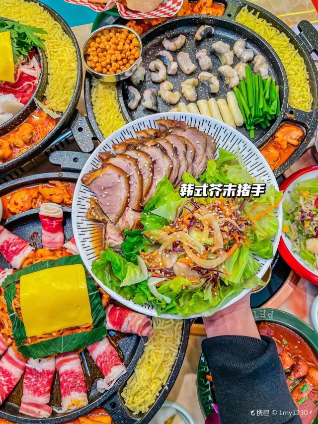 小梁旅行者种草记hello,各位宝子们大家好,我又来啦,今天要给宝子们分享的是咱们宝藏韩料店韩鲜生【韩国料理·部队锅·烤肉(宝安店)】我是小梁如果你喜欢我就关注我呀~🍽【美食攻略】 👉🏻店名:韩鲜生韩国料理·部队锅·烤肉(宝安店) 📍详细地址:兴华二路73-20号(灵芝A1) 🚗交通攻略:地铁5号线灵芝站A1步行650m 🕙营业时间:10:30-22:00 🍽推荐菜品:✔️🔥芝士春川鸡部队锅&八爪鱼五花肉芝士春川鸡铁板: 鸡腿肉🍗五花肉加上芝士,还有泡菜、年糕的 加持!实在能吃出很多花~[100][100][100] 还有活烤章鱼🐙的魅力呢!当然可以沟通一部 分做成刺身一部分用来活烤~ 两全其美~章鱼肉质的鲜美 没有人能拒绝吧😋另外的锅加上面食再倒上热腾腾的芝士!想说瞬间幸福感倍增 ✔️惠灵顿牛排: 19.9r的惠灵顿实在是抱着好奇的心理点的但是居然比想象中的口感惊艳!绝绝子[ThumbsUp][100][100] 外面的表皮偏酥脆 还带着淡淡的奶香!而且切下酥皮还掉渣,这也太酥了吧!!牛肉切开的汁水很足鲜嫩感能明显尝得出来[!]我只想说这波是妥妥不亏的薅羊毛[!][!] ✔️韩式辣鸡爪: 鸡爪入口秒脱骨的口感!入味的香辣感偏微带点甜,肉质带着满满的酱汁~[ThumbsUp][ThumbsUp][ThumbsUp]真的吃起来想舔手指的那种!!!😋😋😋😋 ✔️火山杯面: 最近火山杯面真的很火啊~ 他们家的火山杯面直接一碗热腾腾的芝士淋上又增添了不一样的感觉可以尝尝鲜!能get到芝士火山杯面的快乐的![100][100][100] 🖼餐厅环境:装修风格现代简约时尚可有韩剧氛围感了店里的壁纸也非常的有特色而且很有年代感,拍照蛮好看的,干净整洁,设计感和光线都是蛮不错的~[100][100]是两层小楼,一层是烤肉区,二层是火锅区,二楼才是拍照的好地方哦 💰人均消费:60💰 🍜餐厅总分:整体的就餐环境和氛围都是非常不错的,一家正宗的韩国韩料,一家用心的料理店~服务态度很好~细心且周到!让你有宾至如归的感觉❗️❗️所以宝子们还不快冲[!][?][100][100][100] #韩国料理 #深圳美食 #我的美食日记 #深圳吃喝玩乐 #韩鲜生