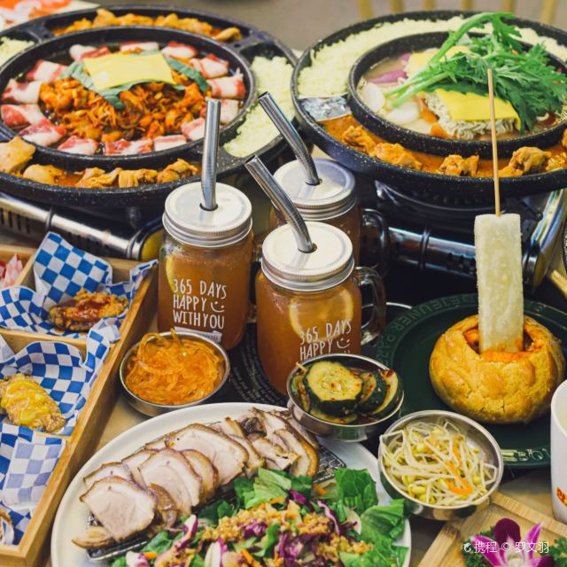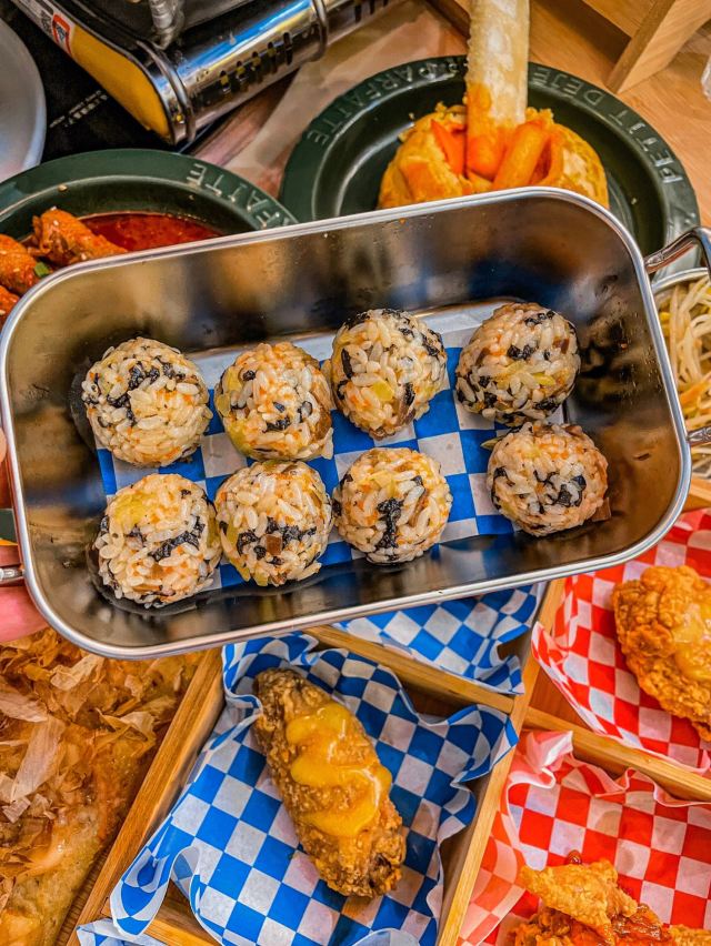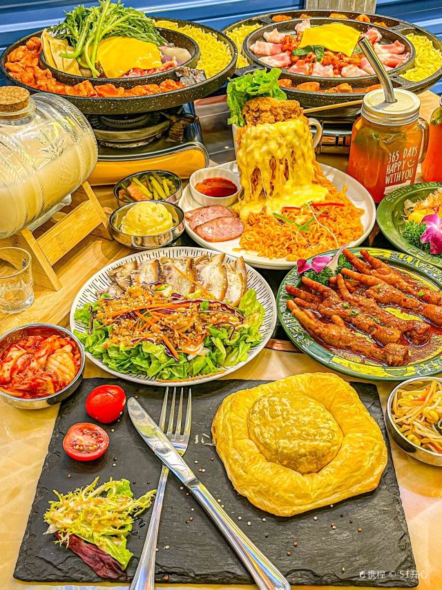 金枪鱼水果蔬菜沙拉,韩式炸鸡,特色蟹籽手抓饭,铁板烤五花肉,碳式烤鳗鱼,芝士玉米