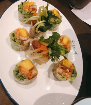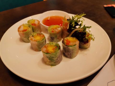 以地中海南为主色调背景,通过墙上的越南老照片和小饰物巧妙地融入了越南风情,白白的瓷盘,昏黄的灯光,让人感觉仿佛置身于越南海边小镇。菜品颜值颇高,味道也很让人惊喜,香茅烤鸡肉捞檬粉,鸡肉鲜香美味,檬粉酸辣适中,搭配在一起非常开胃;芒果鱼柳米纸卷口感清爽,也很特别。