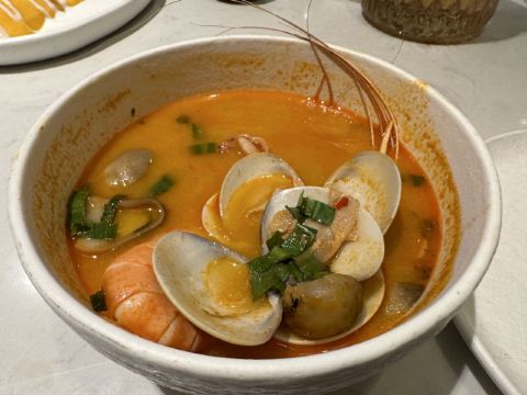 多豆haha冬阴功汤很好喝,还要那个冻柠茶也不错,烤鱼美味,就是有点贵哈哈哈哈