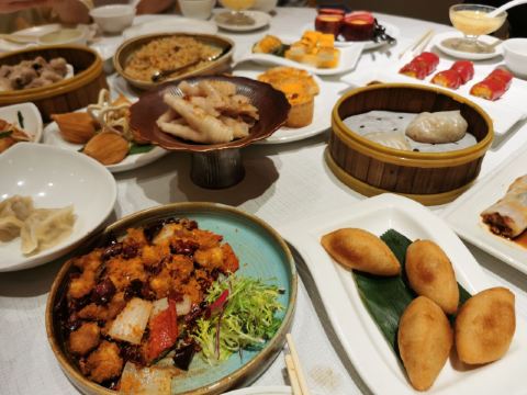 虾饺,鲜虾带子芦笋肠粉,天然红米脆皮肠,百香果布甸,百酱蒸凤爪,黑松露烧麦,鲜麻石锅牛肉粒,肠粉,烧鹅,杨枝甘露,XO酱牛筋,蓝莓蛋挞