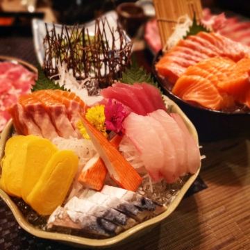 碳烧小牛排,日式炸鸡块,黑蒜烤生蚝,海盐芝士大虾,樱花虾炒饭,日式火锅,土司鵝肝,鲷鱼刺身,碳烤牛小排,三文鱼,刺身拼盘,膝软骨串烤,牛油果软壳蟹,天妇罗炸虾,冰菜沙拉,海鲜泡饭,炙烧寿司组合,象拔蚌