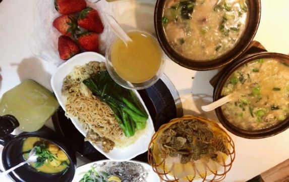 咖喱鱼蛋,冰糖陈皮莲子绿豆沙,海鲜粥,皮蛋瘦肉粥,莲子花生红豆沙,白灼菜心,凉拌鱼皮,鱼皮角蚝油捞竹升面,耗油捞粉肠,虾饼,咸蛋黄,猪杂粥,萝卜干,鲮鱼球蚝油捞竹升面