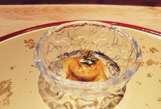 茶碗蒸,清酒煮鲍鱼,紫苏海胆天妇罗,日本生蚝,静冈蜜瓜,北海道松叶蟹肉啫喱