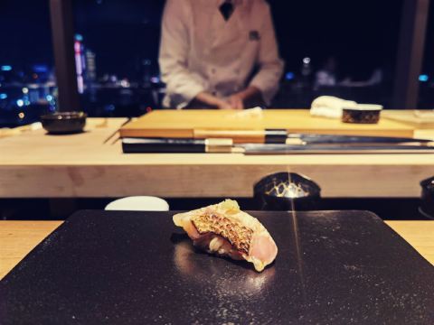 最近一直在北京出差,偶然机会回到大深圳,还是觉得回到深圳神清气爽,毕竟气候环境和美食,感觉深圳都比帝都好很多~ 今天去了朋友推荐的“隐omakase”,听闻是广州开过来的Omakase日料,能从广州开到深圳,说明功夫深,底子厚,要不然在深圳这个藏龙卧虎的地方,确实是需要勇气和信心。 餐厅位于财富大厦41楼,位置比较好找,交通也是停方便的,福田会展中心CBD商圈,人流如织,商业重地,估计租金也不便宜,而且开在41楼,目前是我吃过的最高的Omakase餐厅,称之为“高空Omakase”也是恰如其分。 师傅来自香港,年轻帅气,动作行云流水,当日餐厅比较忙,板前位置坐满了客人,和师傅没有太多的交流,一直在体验美食,不过工作人员还是非常周到,看到我一直在拍照,就和我一直介绍和聊天,发现这个美食圈子真的很小,竟然有很多共同的朋友,他也很健谈,介绍了品牌的发展和规划,还是比较有想法的,特别是他们目前推出的“999999元Omakase单人餐年卡”,个人觉得是非常超前的想法,奢爱Omakase日料的朋友,可以一试,毕竟是年卡,折合下来,每餐成本很低啊! 出品创新立意,有很多主厨自创的料理,不管是手法、装盘、口味都是别出心裁,值得细细品味。食材选料也是比较严谨,从感官上体验非常棒错。 餐厅的音乐值得一说,不同时段、不同氛围的音乐,感觉很不一样,很喜欢这样的氛围。