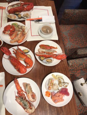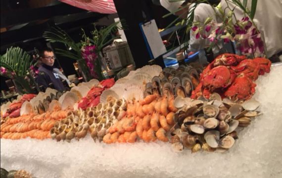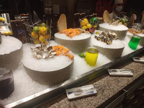 这是香格里拉大酒店内的自助餐厅,可供选择的食物种类多样,海鲜档内的海鲜更是新鲜又美味,生蚝是现场打开的,很有人气。