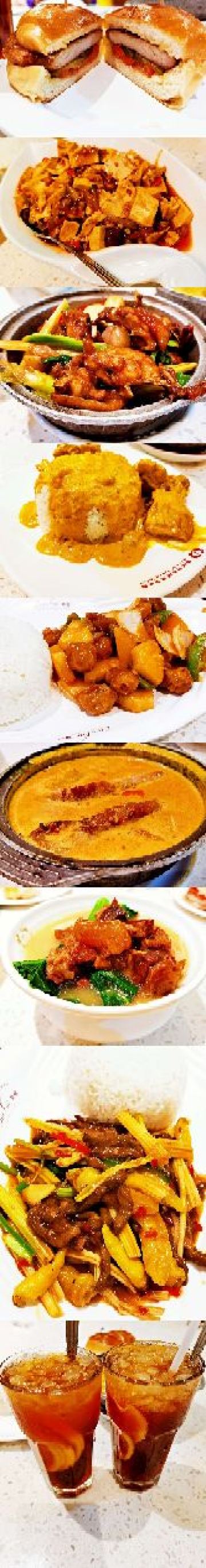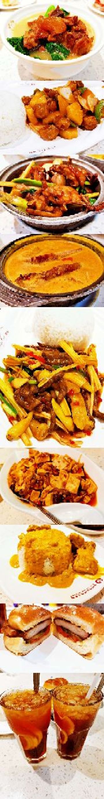 咖喱牛腩饭,原只烧鸭,新发烧鹅,蜜汁叉烧饭,法兰西多士,烤乳猪,菠萝包,冻柠茶,菠萝油,冻奶茶,鱼香茄子煲,港式丝袜奶茶,烧鹅