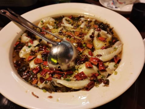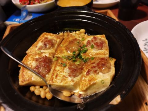 初入店门,墙板上客家“土楼”的剪影和挂画,木质玻璃框架里的古书和雕像,就让人有种恍惚隔世的悠闲惬意。土楼建筑式菜盘,雕纹青花瓷餐具和古铜黑漆茶壶,不仅彰显了乡土特色元素,还饱含了时尚和情趣的就餐格调。 最后点了客家特色菜:客家酿豆腐,再点了自己爱吃的万绿湖小鱼干和梅县算盘子,菜量适中,美味可口。总体来说,嗝~还行