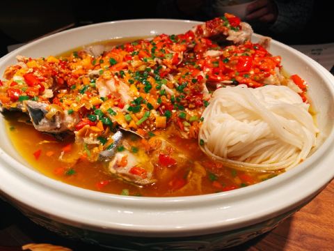 很赞的一家湘菜馆,包间的装修很特色,整的以前那种瓦片屋顶。服务也挺好,听说我们有人过生日,让厨房下长寿面,免费送。 ❖「江南富贵神仙鸡」特别香,好吃。 ❖「湘西霸王一代鱼头配米线」很辣,但味道很赞,特别是加了汁的米粉。 ❖「芝麻菠菜」味道蛮特别的,香香的。 📣 ❖「小米油渣土豆丝」唯一不合口味的是这个土豆丝,个人偏爱酸辣土豆丝,它这个做法味道接受不了。 🚇交通:岗厦地铁站B出口再步行370米