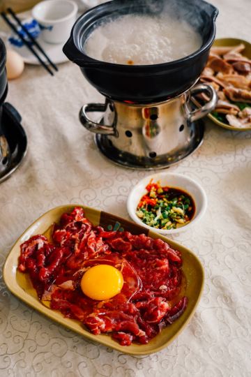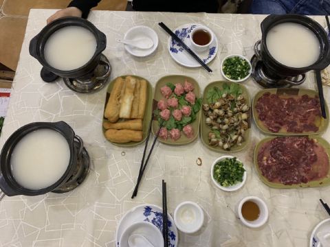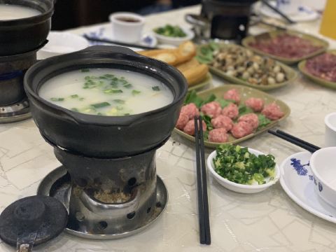 看到很多人都推荐这家粥底火锅店,特意过来打卡试试。原来是可以一人一锅,点一斤牛肉就有一锅粥。牛肉用蛋清浸泡,特别滑嫩。基本上每个人都必点。其他食材也不错,分量也可以。粥底会帮你一直添加,最后的时候粥很鲜甜,特别好吃。
