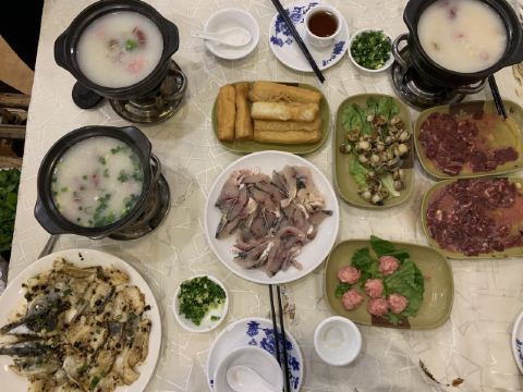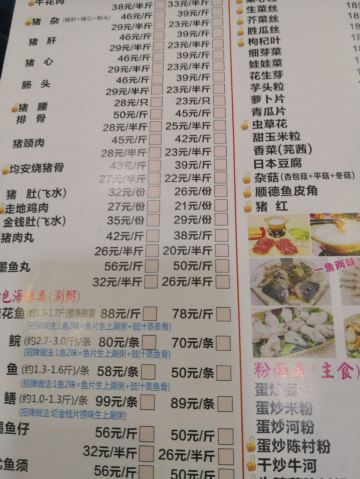 猪肉丸,粥底火锅,牛花肉,广式油条,猪杂,菜心粒,鸡蛋,牛五花,墨鱼丸,炒陈村粉,排骨蒸陈村粉,毋米粥,鲫鱼,蒸生蚝,姜葱拌猪手,炒米粉