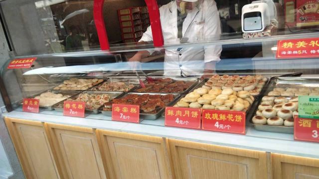 生煎,松子瓜仁核桃仁红年糕,汤包,鲜肉馄饨,苏式面条,糕点,猪油年糕,玫瑰方糕,小笼包,煎馄饨