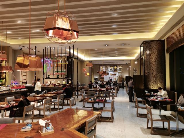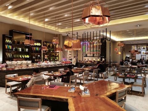 餐厅装修风格摩登现代,提供种类丰富的自助餐品,琳琅满目,摆盘精致。为了保证出品口感,还有现烤的牛排、生蚝、羊排等,火候把握的极好,口感令人愉悦。