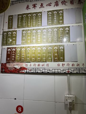 桂花马蹄糕,小笼包,大馄饨,芡实粥,玫瑰猪油糕,赤豆糕,芝麻卷,鳝丝面,黄豆馅夹团,油条,小馄饨,甜豆浆,麦芽塌饼