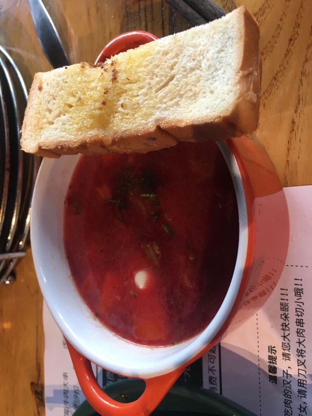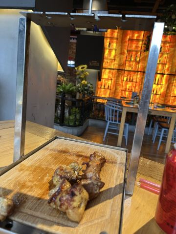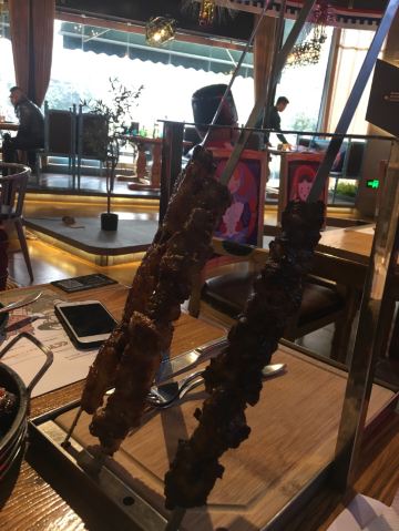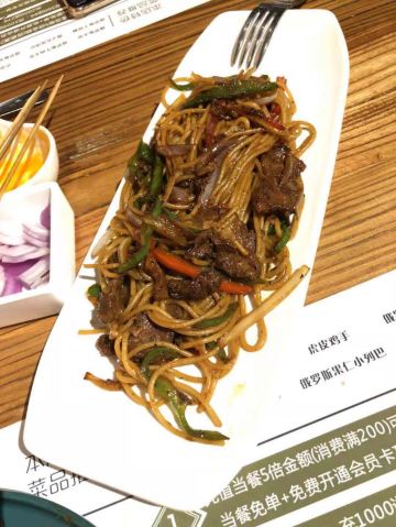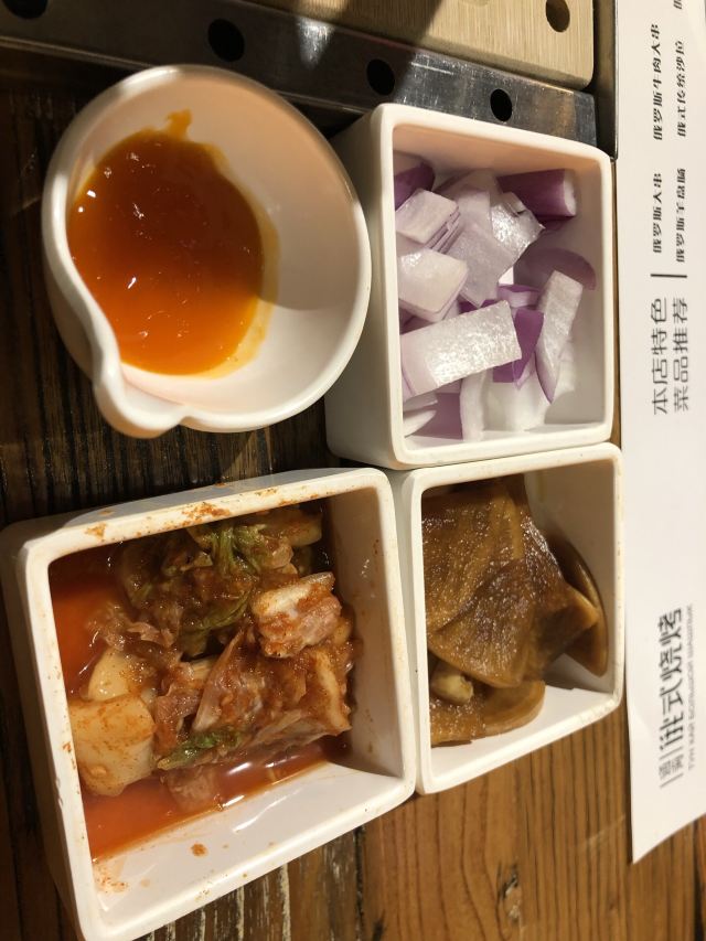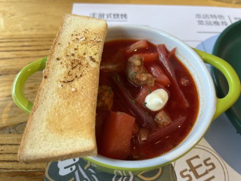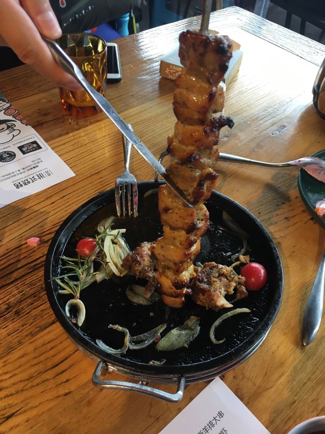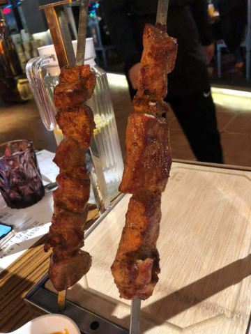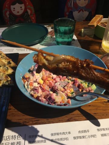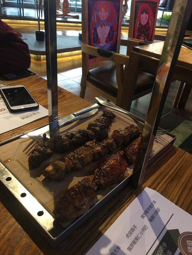 第一次来这家店!一下子就喜欢上了! 肉串真的是无敌大!所以,最好人多一点,能吃到的品种也就多一点。不然,一串肉一根肠下去,直接饱了。个人喜欢鸡肉串。 除了肉类,醋小皮蛋、俄式红菜汤、俄式烤香菇、泡椒鱼皮都好好吃。俄罗斯猪心有点老..…有点硬香的感觉。
