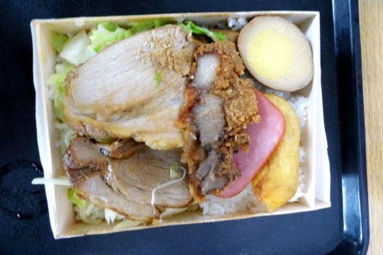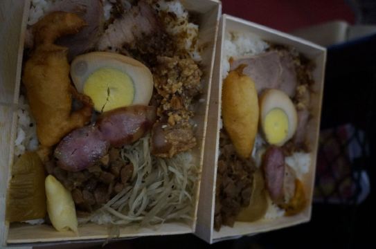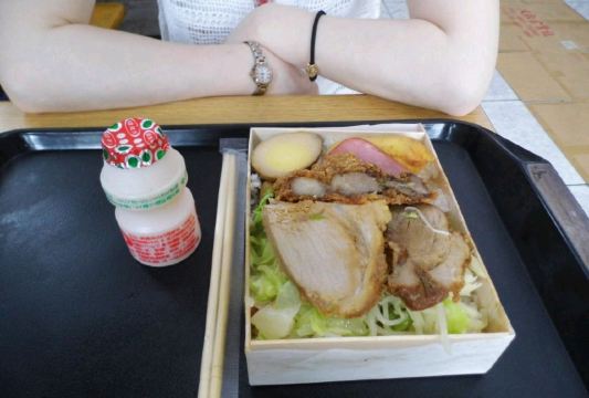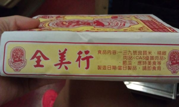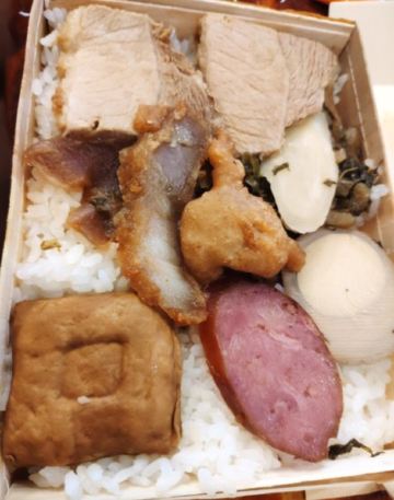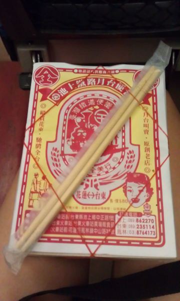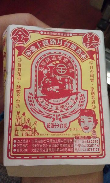 池上便当又叫池上饭包,是比较出名的一家卖便当的特色快餐店,它在台湾已经有50多年的历史了,快餐都是用池上米和特色的木盒装盛,只有6种快餐,据说是为了保证产品单一,口味纯正。来到附近一定要尝尝,我们没时间到店铺品尝,是在枋寮站到花莲站的路上途径池上站的时候跑去月台买的,火车只停很短的时间,必须要抓紧时间,准备好零钱去买。便当里有蛋、猪肉、肠、姜等等。吃的时候已经不太热,菜吃上去的味道没有想象中好,但米饭还是可以的,很Q,够嚼头。