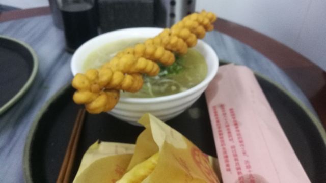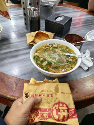 Hao GangGang YangZaGe Dian (LiuXiang)太原第一餐,来柳巷附近的郝刚刚吃羊杂。 排队排了老长,好在速度够快,大约半小时左右排到。 「羊肉汤」 羊肉汤里的羊肉大块,吃起来还蛮香。粉丝是粗的粉条那种,还蛮入味。 「羊杂汤」 羊杂汤里的羊杂偏硬,初秋里喝一碗热汤还是蛮暖胃的。汤底都是一样的,所以只要根据自己喜好选择羊肉、羊肉、羊肚丝就好。 「油酥饼」 油酥饼感觉就是普通的烤饼,可点可不点。 「大麻花」 麻花是脆麻花,一点不香,可以忽略。 服务输出全靠吼,声明在外的小店,服务就忽略吧。