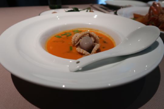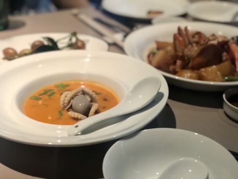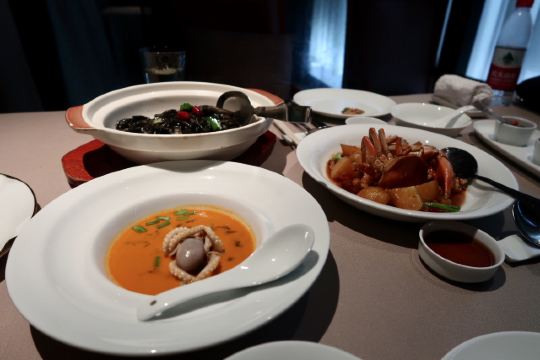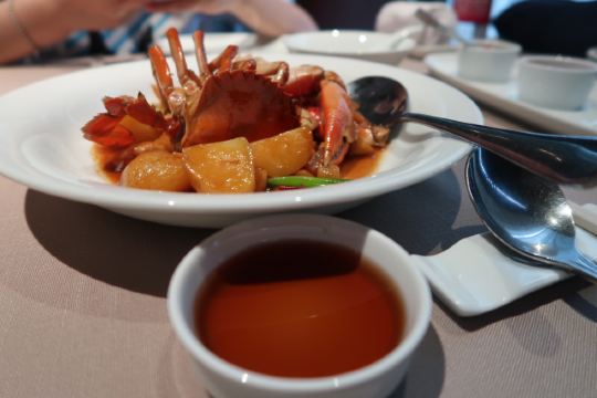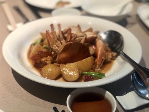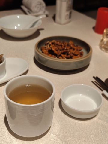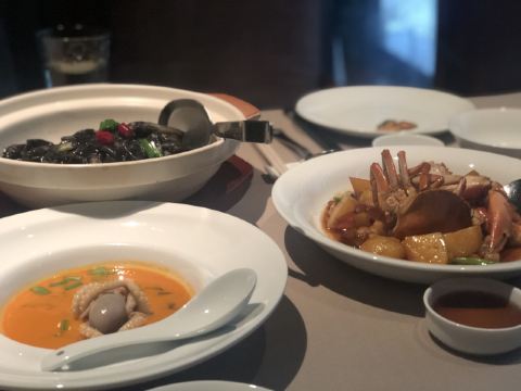 XINRONGJI日子选的比较好,跟小伙伴相约台州美食之旅,第一天的晚餐就约在这里,算是台州菜的鼻祖级,在魔都也算得上比较有档次的江浙菜带海鲜的餐厅。分店有4家,选一家距离酒店比较近的椒江店,据说另外一家临江的更嗲一些。 ✨环境比较幽暗,看得出服务还是挺训练有素的,上菜、换骨盘、换毛巾等等,一个颜色或手势就心领神会了,而且还不要额外的服务费,这点必须点赞。 明档选海鲜,大到燕鲍翅、小到海虾蟹都有,养在水缸里,活的总是新鲜。看看白蟹是季节必吃,点了2只2种做法,清蒸and红烧,似乎清蒸的更合胃口,自带的甘甜味和海鲜的鲜味我挺喜欢,也很饱满,都会配醋蝶,不过我都是吃原味。 富贵金沙鸡,本来想点乳鸽来的,脆皮乳鸽是先做的,进门就看到了,不过当日售罄只能退而求其次选了鸡,半只的样子,皮倒是真的香脆的,肉还是听嫩的,半只也正好,多了吃不下,不过还是想试试乳鸽,残念。 砂锅鱼头,说是做了20多年的招牌菜,鱼头下面是蒜头,上桌还滋滋作响,砂锅的保温效果不错,吃起来烫口,味道都进去了自然口感real棒,鱼头肉很滑嫩。 黄金脆带鱼,油多才能煎出这样黄金色泽的带鱼来而且ms吸过油,吃起来只有香脆,临海城市才能吃到的第一口新鲜,超爱,每一片大概30+人民币的样子。 家烧萝卜片,萝卜还是那个萝卜,切成小块,简单的食材,不简单的口感,自家是做不出来的,所以还是店里解馋吧,水润度也很好。 望潮煮酸菜,酸菜鱼望潮版,望潮一只只算,好像50几元一只,经过摔打和按摩的小章鱼就是Q弹得发指,酸菜的酸辣度适中,喝点汤也hin不错。短蛸是其学名,记得《舌尖上的中国》有一集专门介绍过,不知道有没有白灼版,现在越来越喜欢原味的东东。 沙蒜烧豆面,算是必点。沙蒜-海葵,软体动物,吃起来有嚼劲,增添咸鲜味。豆面也是豆类做的,吃起来类似细细的粉条,两者结合,汤头真的鲜美。 玫瑰五谷包,雪山包的外壳,香脆;五谷反正比五仁好吃,趁热下肚,完美。 雪花和牛塔,芝士塔但不可拉丝,也是趁热吃,挺浓郁的,酥皮确实有层级,不过跟五谷包比起来我更喜欢后者。 有茶喝,还根据时节不同二变化,天热送的是20几味herb做的带有点微甜口感的茶水。不过又点酸梅汁,偏酸型。餐前有时令水果红提,开胃小碟,餐后有自制酸奶送。中秋节应景还送了五仁月饼,心意领了,五仁属于我接受无能。