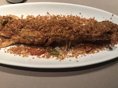 peachsai日子选的比较好,跟小伙伴相约台州美食之旅,第一天的晚餐就约在这里,算是台州菜的鼻祖级,在魔都也算得上比较有档次的江浙菜带海鲜的餐厅。分店有4家,选一家距离酒店比较近的椒江店,据说另外一家临江的更嗲一些。 ✨环境比较幽暗,看得出服务还是挺训练有素的,上菜、换骨盘、换毛巾等等,一个颜色或手势就心领神会了,而且还不要额外的服务费,这点必须点赞。 明档选海鲜,大到燕鲍翅、小到海虾蟹都有,养在水缸里,活的总是新鲜。看看白蟹是季节必吃,点了2只2种做法,清蒸and红烧,似乎清蒸的更合胃口,自带的甘甜味和海鲜的鲜味我挺喜欢,也很饱满,都会配醋蝶,不过我都是吃原味。 富贵金沙鸡,本来想点乳鸽来的,脆皮乳鸽是先做的,进门就看到了,不过当日售罄只能退而求其次选了鸡,半只的样子,皮倒是真的香脆的,肉还是听嫩的,半只也正好,多了吃不下,不过还是想试试乳鸽,残念。 砂锅鱼头,说是做了20多年的招牌菜,鱼头下面是蒜头,上桌还滋滋作响,砂锅的保温效果不错,吃起来烫口,味道都进去了自然口感real棒,鱼头肉很滑嫩。 黄金脆带鱼,油多才能煎出这样黄金色泽的带鱼来而且ms吸过油,吃起来只有香脆,临海城市才能吃到的第一口新鲜,超爱,每一片大概30+人民币的样子。 家烧萝卜片,萝卜还是那个萝卜,切成小块,简单的食材,不简单的口感,自家是做不出来的,所以还是店里解馋吧,水润度也很好。 望潮煮酸菜,酸菜鱼望潮版,望潮一只只算,好像50几元一只,经过摔打和按摩的小章鱼就是Q弹得发指,酸菜的酸辣度适中,喝点汤也hin不错。短蛸是其学名,记得《舌尖上的中国》有一集专门介绍过,不知道有没有白灼版,现在越来越喜欢原味的东东。 沙蒜烧豆面,算是必点。沙蒜-海葵,软体动物,吃起来有嚼劲,增添咸鲜味。豆面也是豆类做的,吃起来类似细细的粉条,两者结合,汤头真的鲜美。 玫瑰五谷包,雪山包的外壳,香脆;五谷反正比五仁好吃,趁热下肚,完美。 雪花和牛塔,芝士塔但不可拉丝,也是趁热吃,挺浓郁的,酥皮确实有层级,不过跟五谷包比起来我更喜欢后者。 有茶喝,还根据时节不同二变化,天热送的是20几味herb做的带有点微甜口感的茶水。不过又点酸梅汁,偏酸型。餐前有时令水果红提,开胃小碟,餐后有自制酸奶送。中秋节应景还送了五仁月饼,心意领了,五仁属于我接受无能。