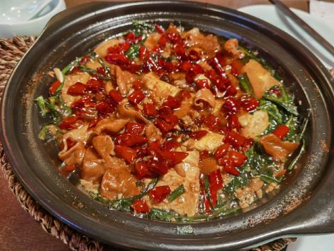 会宾楼是泰州当地比较出名悠久的中华餐饮名店,是集客房、餐饮、会务、休闲等综合性服务功能于一体的酒店。一楼和二楼都是餐厅,早上是泰州的早茶名店,晚上主打是淮扬名菜和苏锡菜系。金陵双臭,大家都会好奇什么是双臭,其实就是臭豆腐+肥肠,“闻起来臭,吃起来香”,肥肠好好吃,可惜就是量少。蒜泥小龙虾,没有太厚重的香料味,蒜泥的香更能体现小龙虾的鲜美。每个小龙虾都个头饱满,虾肉Q弹紧实,肉质鲜嫩肥美。红烧河豚鱼,河豚鱼味道极为鲜美,与鲥鱼、刀鱼并称为“长江三鲜”。江苏十大经典名菜之一。河豚含有河豚毒素,要小心处理。河豚鱼肉比较肥美鲜嫩,味道还不错。